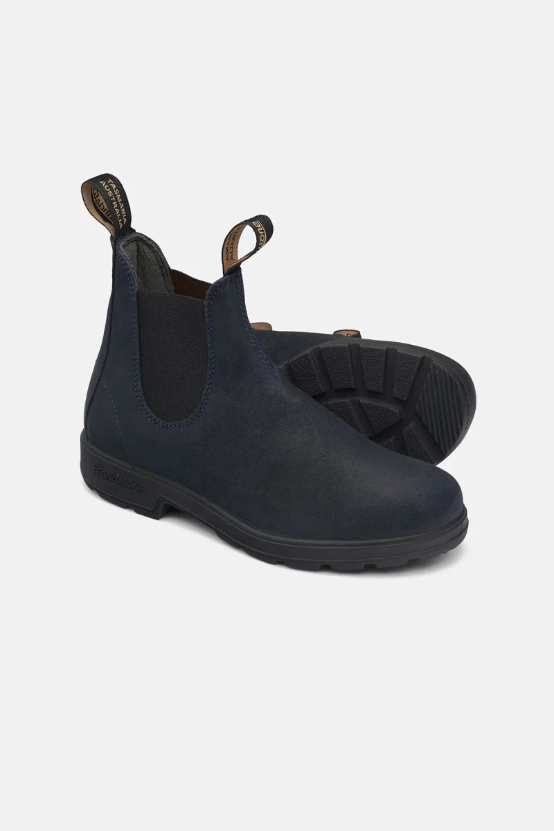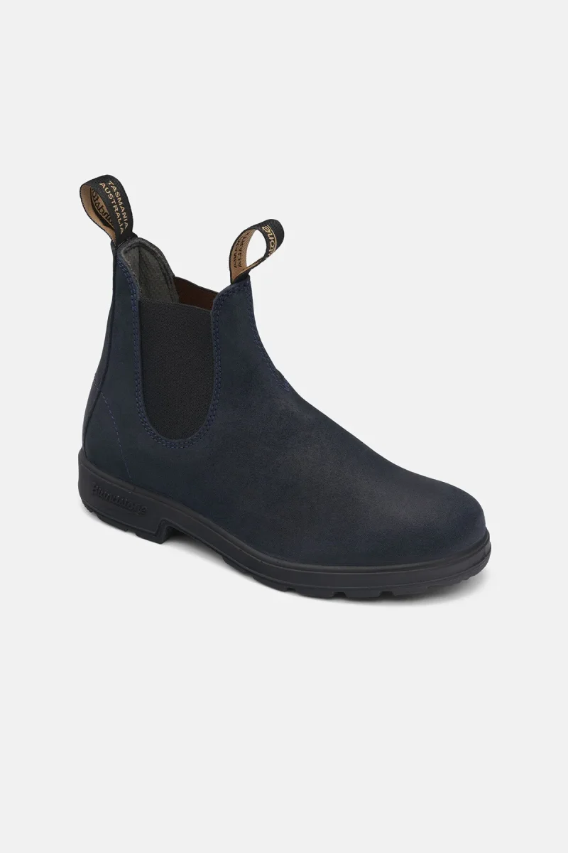 Lo stivaletto sportivo modello Blundstone #1912 in stile Chelsea è realizzato in pelle scamosciata e cerata idrorepellente blu navy, che saprà garantirvi protezione anche in caso di pioggia o neve. Tomaia liscia con classici elastici laterali neri, linguette per aiutare la calzata e comoda suola in gomma antiscivolo con tallone rialzato. Una scarpa della serie Originals per i look quotidiani in pieno comfort.