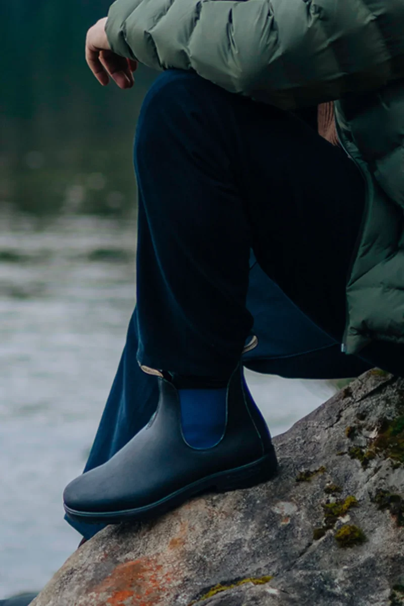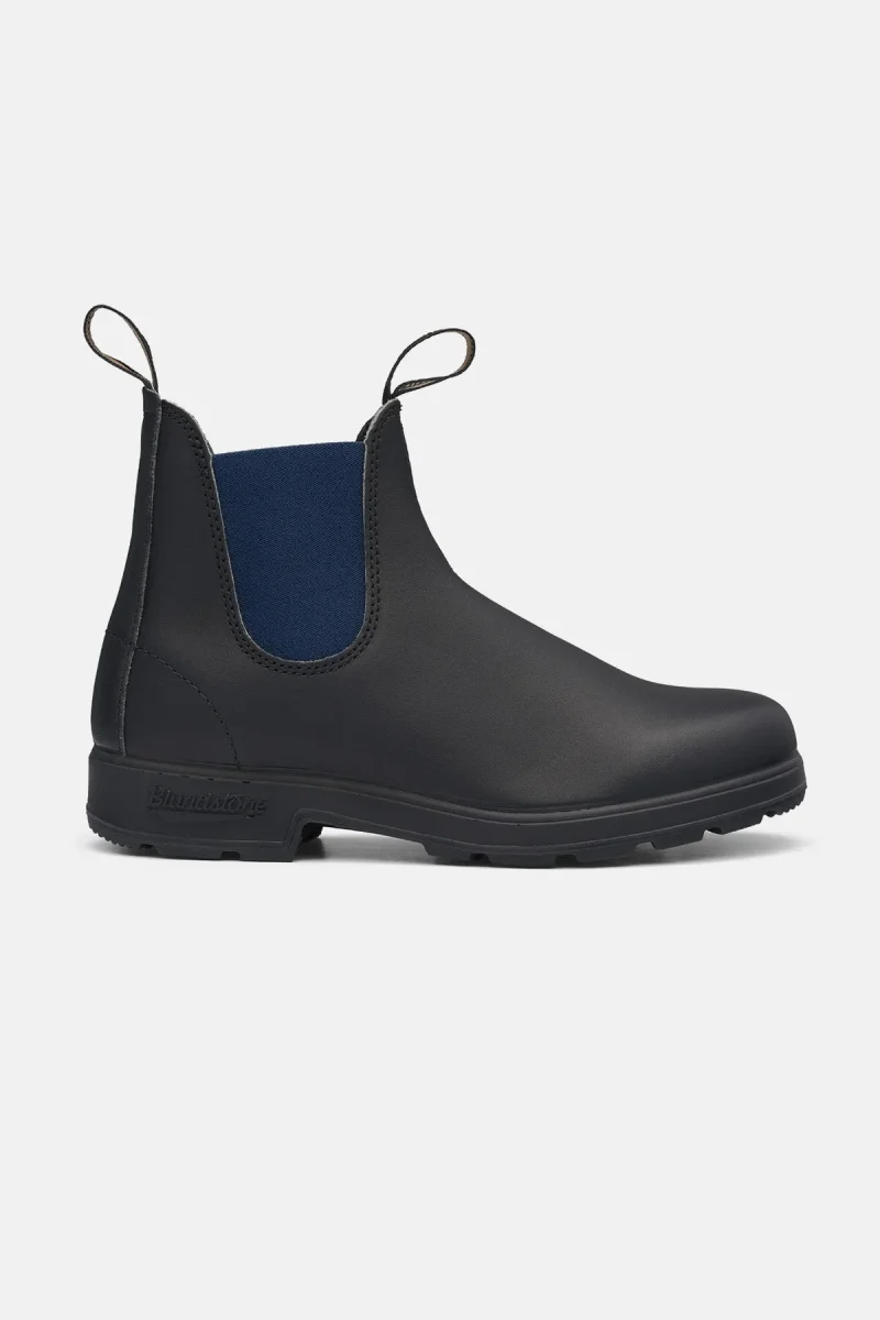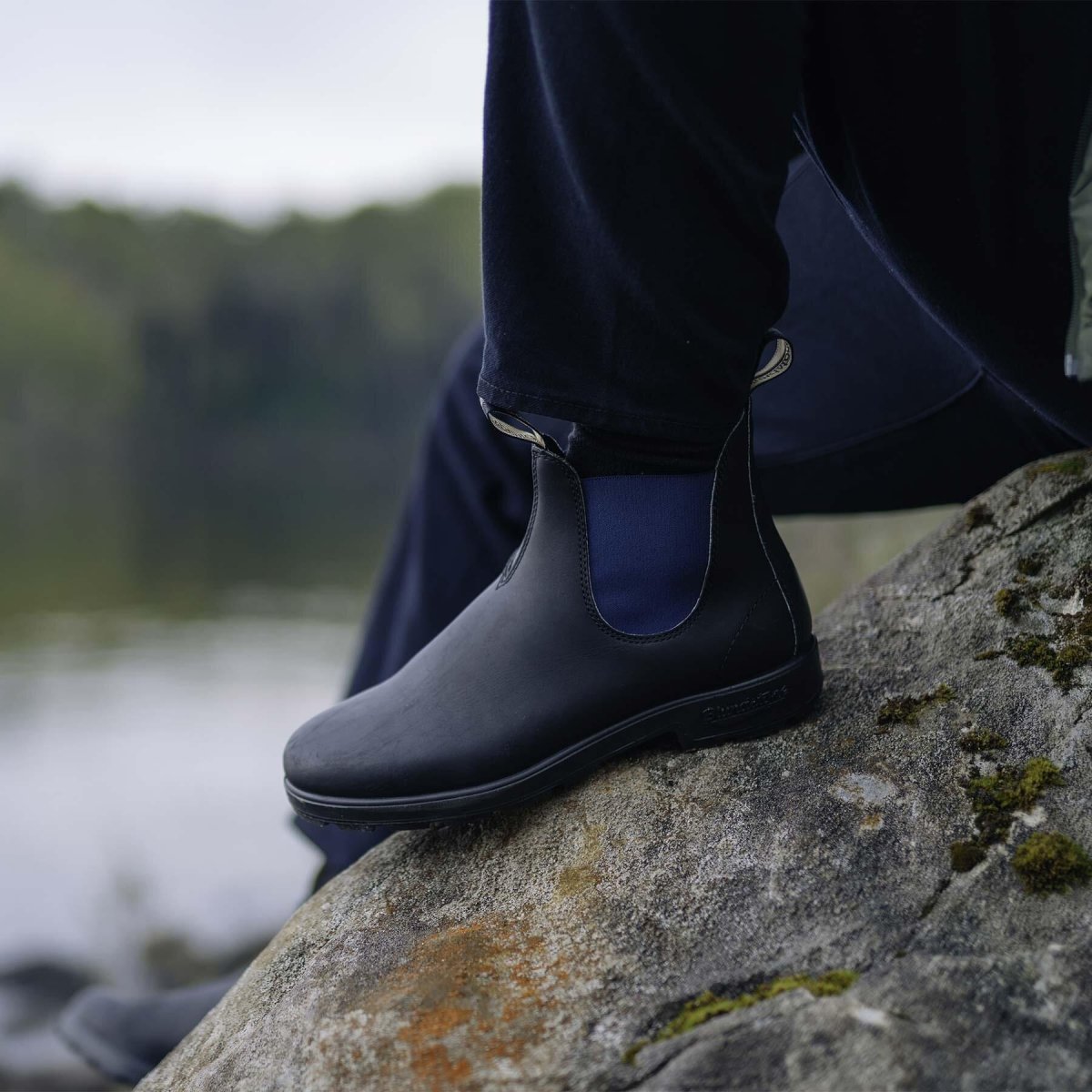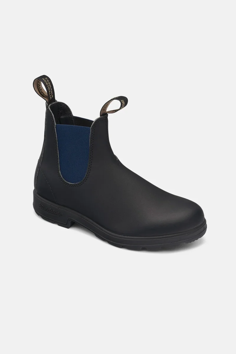 Gli stivaletti modello Blundstone #1917 con tomaia in pelle nera, si caratterizzano per l’appeal fashion dato dagli elastici laterali blu navy a contrasto. Dotati di linguetta frontale e posteriore per facilitare la calzata, sono realizzati in stile Chelsea boots e si elevano su di una comoda suola in gomma antiscivolo con tallone rialzato e logato. Una scarpa comoda e alla moda della serie Originals, di facile abbinamento.