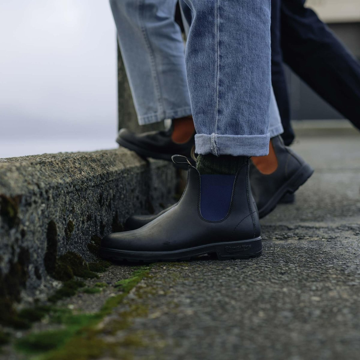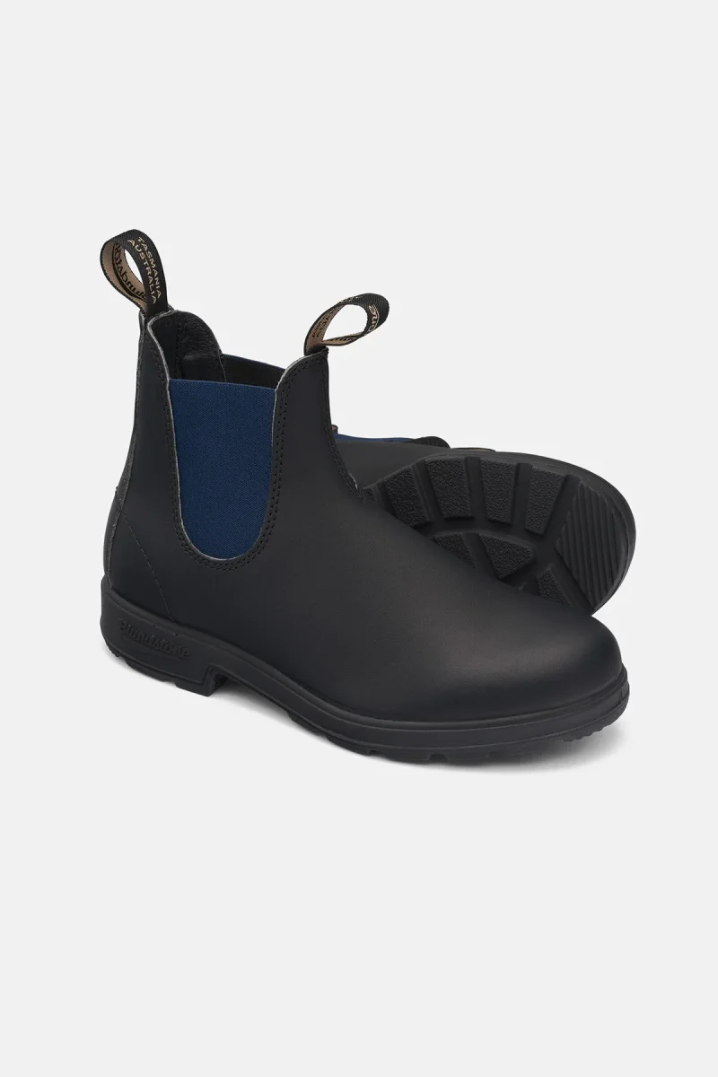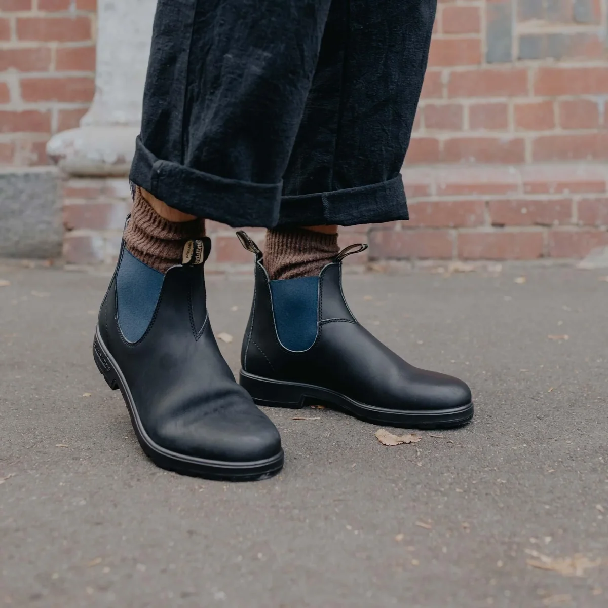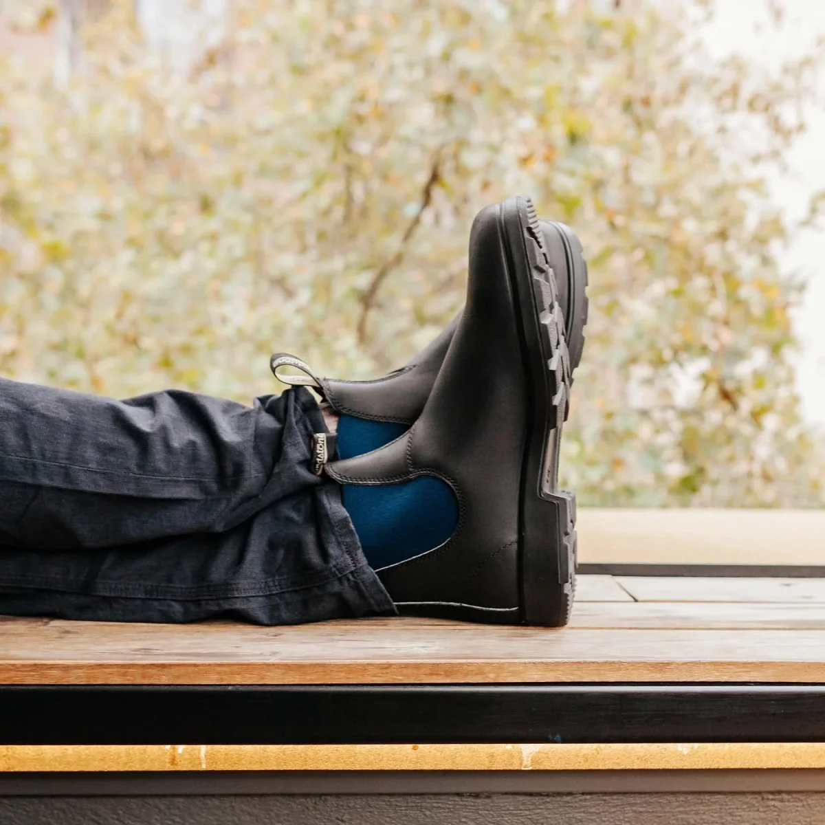 Gli stivaletti modello Blundstone #1917 con tomaia in pelle nera, si caratterizzano per l’appeal fashion dato dagli elastici laterali blu navy a contrasto. Dotati di linguetta frontale e posteriore per facilitare la calzata, sono realizzati in stile Chelsea boots e si elevano su di una comoda suola in gomma antiscivolo con tallone rialzato e logato. Una scarpa comoda e alla moda della serie Originals, di facile abbinamento.