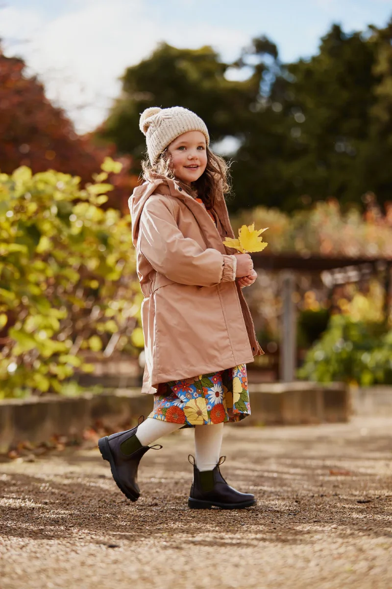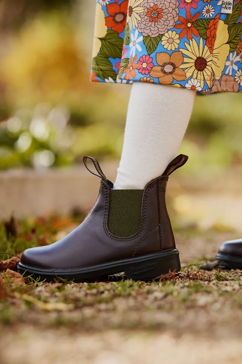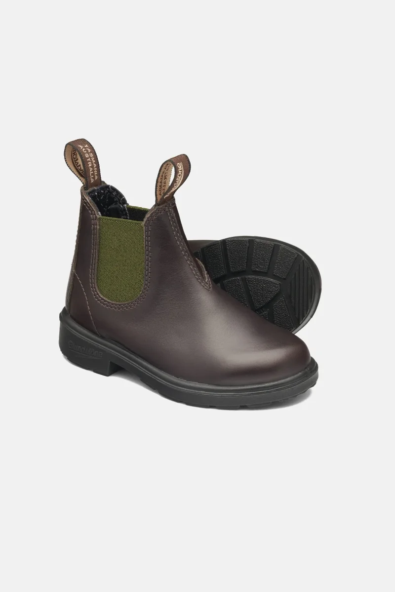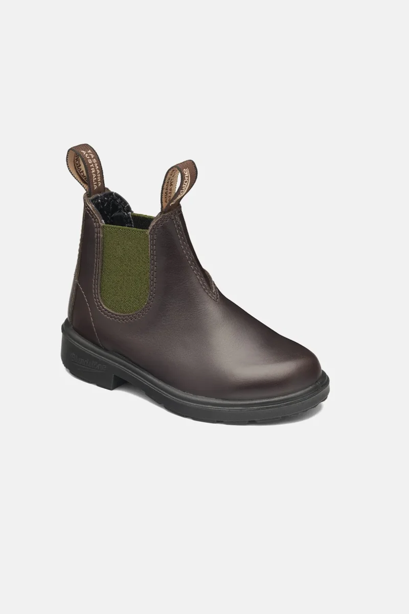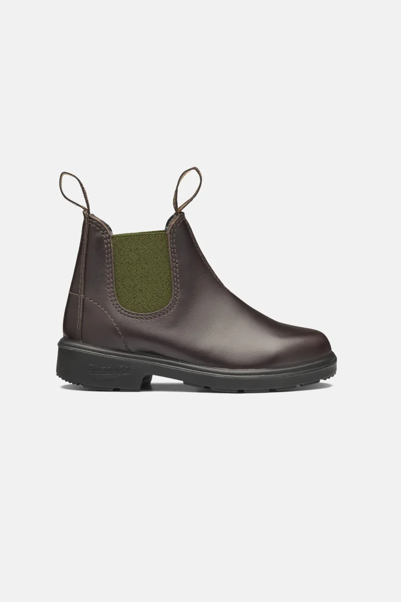 Gli stivaletti Blundstone #2394 della serie Kids, realizzati in pelle marrone resistente all’acqua con elastici laterali color oliva, sono stati progettati pensando alla sicurezza dei vostri bambini.