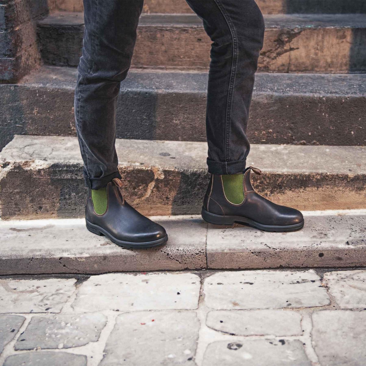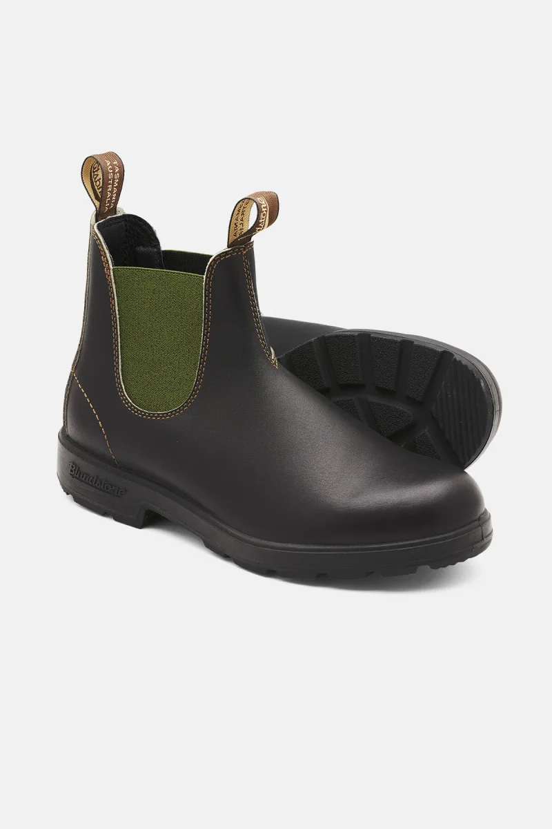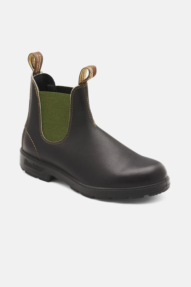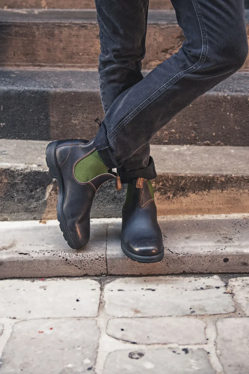 Look fashion per lo stivaletto silhouette Chelsea modello Blundstone #519, realizzato in pelle marrone resistente all’acqua con elastici laterali verde oliva. Presentano tomaia liscia con impunture frontali e sul tallone per un tocco ricercato. Linguetta anteriore e posteriore per una calzata facile e suola in gomma dentata antiscivolo. Stivaletti casual chic della serie Originals, per look quotidiani che vi faranno notare per classe e stile.