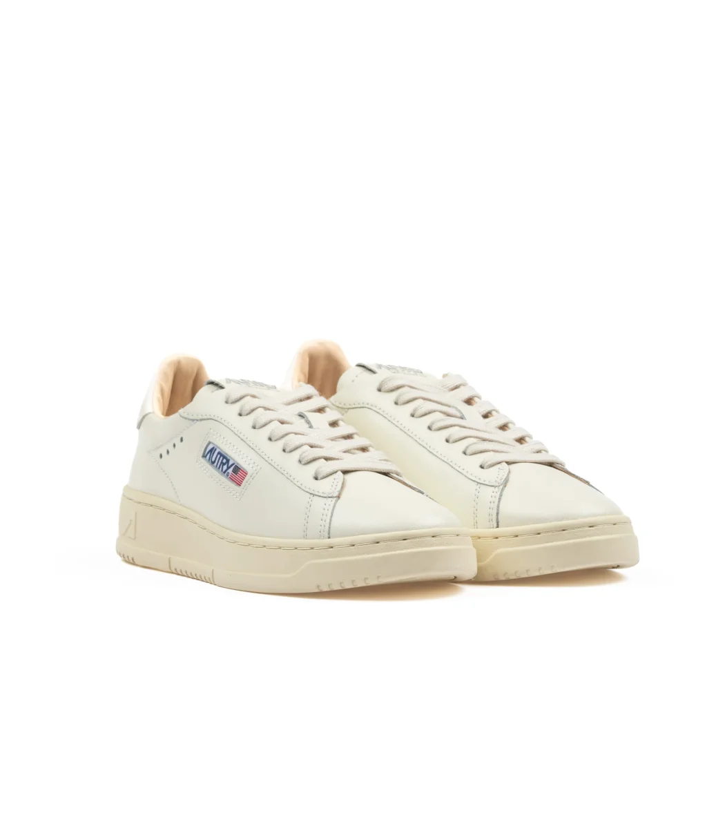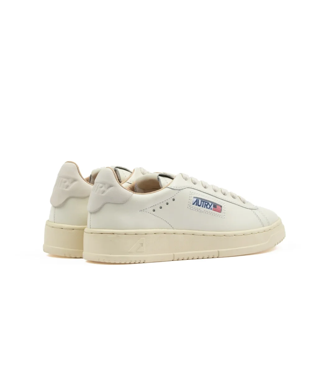 Sneakers Autry bassa Dallas in pelle liscia bianca. Il modello Dallas, con un design vintage ispirato gli anni ’80 ha una tomaia in pelle, con punta traforata per il sudore. La fodera interna è in pelle e la suola è in gomma vintage. Modello donna colore bianco sporco. Calzata abbondante, disponibili solamente numeri pieni in taglie europee. Codice: ADLWMR01