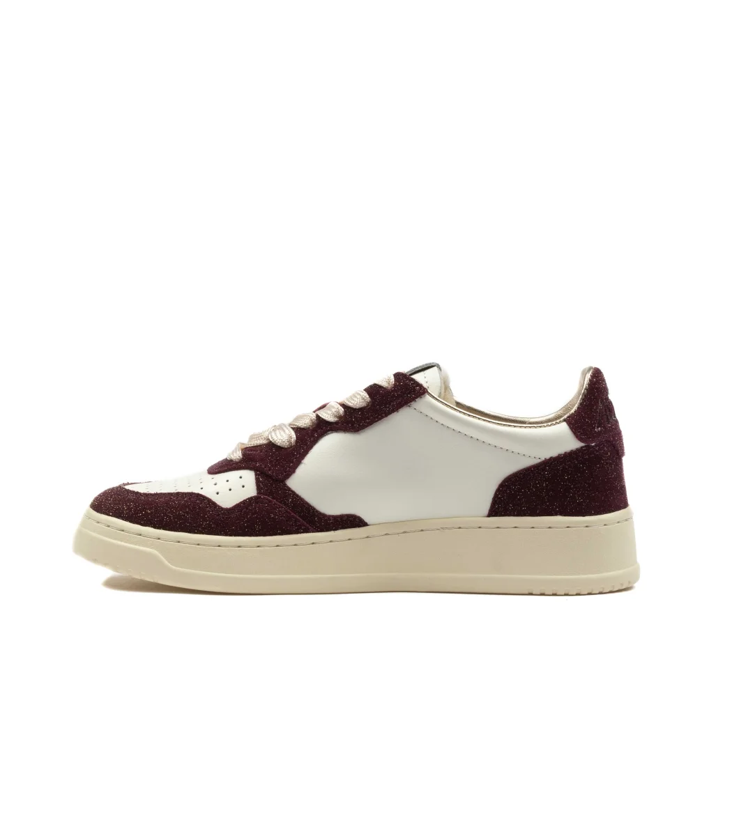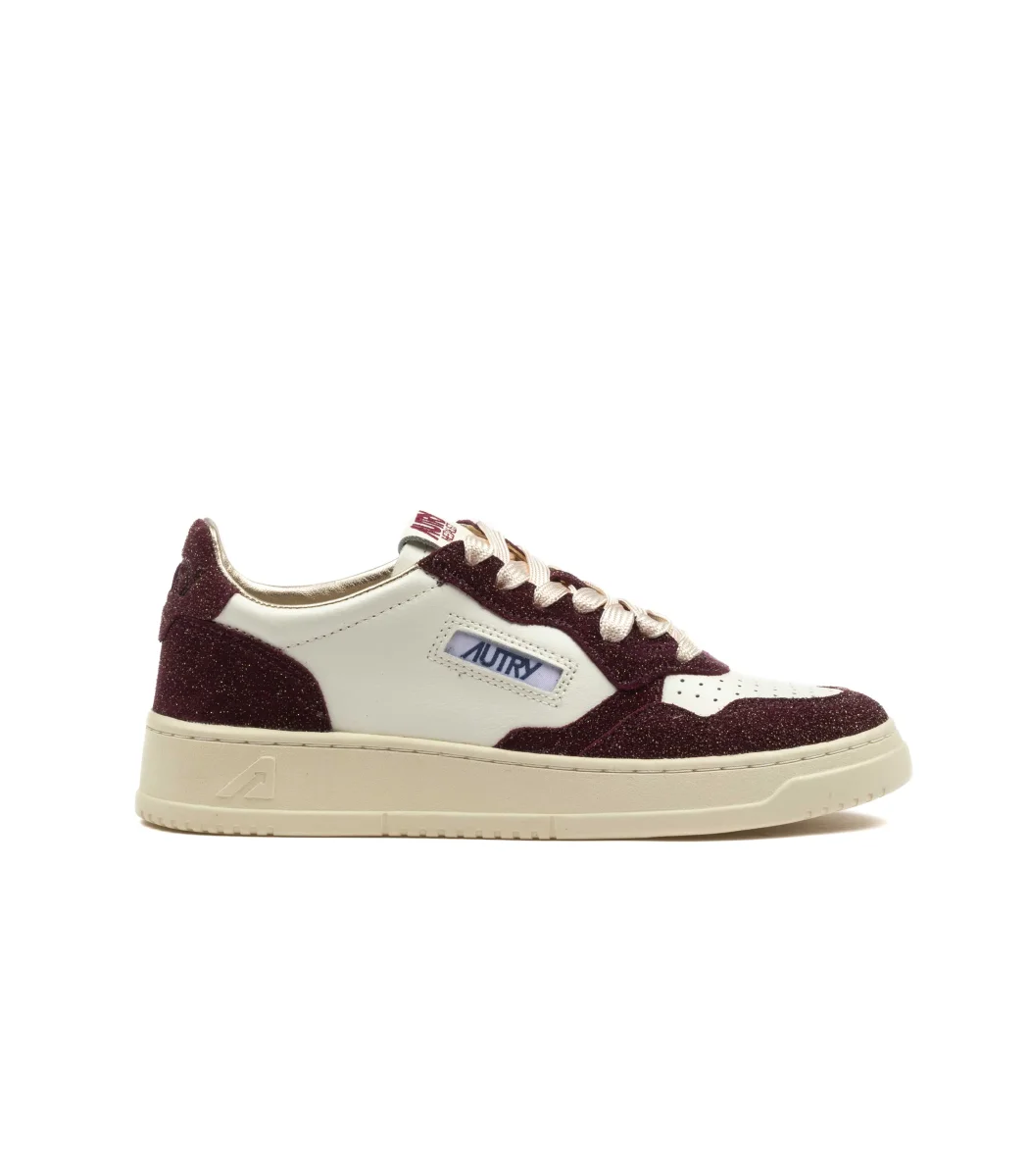 Autry Medalist Low Stars Glitter – Bianco / Bordeaux (Donna) Estetica vintage e dettagli glamour. Le Autry Medalist Low Stars Glitter in versione bianco e bordeaux da donna mixano l’ispirazione tennis anni ’80 con stelle glitterate per un tocco bold ma raffinato. Realizzate in pelle premium, presentano una silhouette low-cut, finiture rétro e una suola off-white effetto used. Il logo Autry con bandiera USA rifinisce un modello perfetto per distinguersi, ogni giorno.