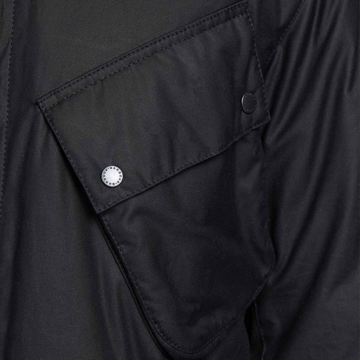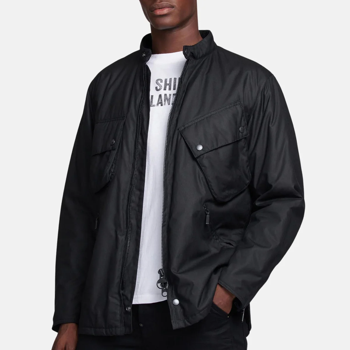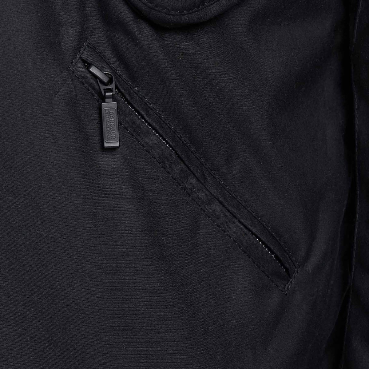La giacca cerata Barbour International Harlem è realizzata in cotone cerato da 6 once con carré posteriore interno in lana e fodera in cotone. Questo modello presenta due tasche a soffietto sul petto foderate in cotone, tasche a filetto in basso con cerniera a getto e polsini con cerniera per un autentico stile da motociclista.