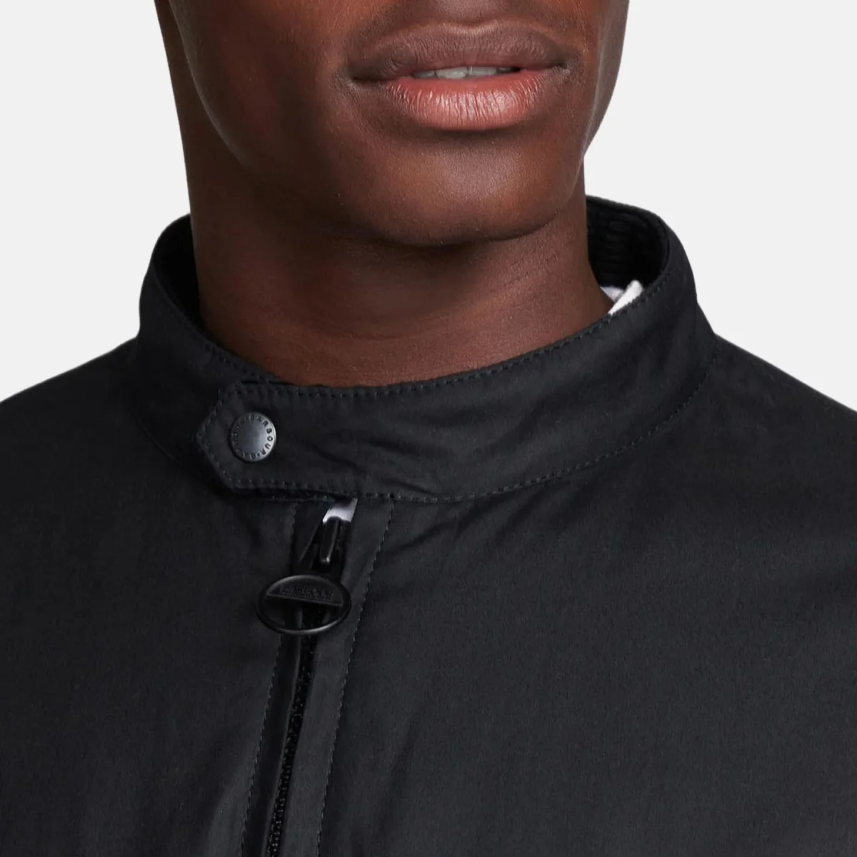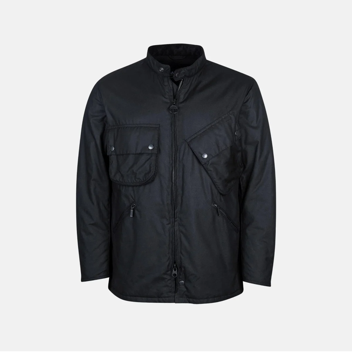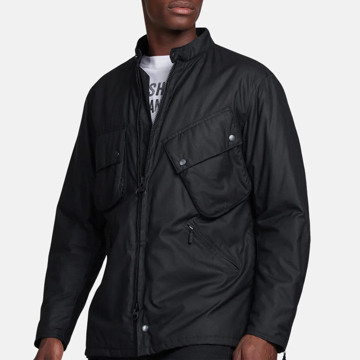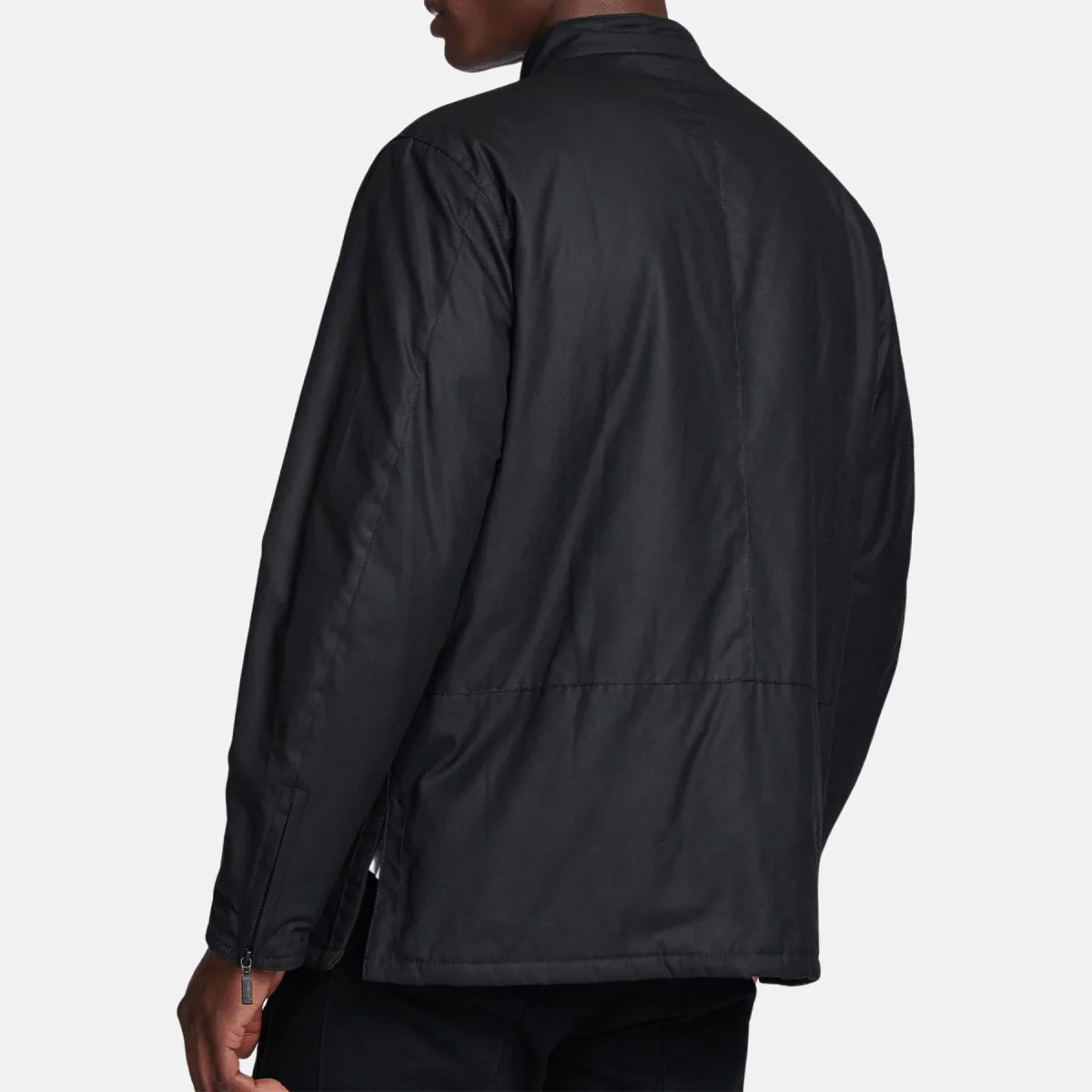 La giacca cerata Barbour International Harlem è realizzata in cotone cerato da 6 once con carré posteriore interno in lana e fodera in cotone. Questo modello presenta due tasche a soffietto sul petto foderate in cotone, tasche a filetto in basso con cerniera a getto e polsini con cerniera per un autentico stile da motociclista.