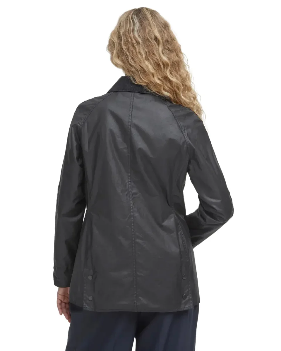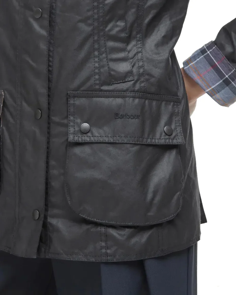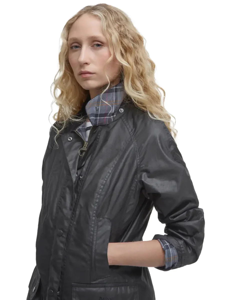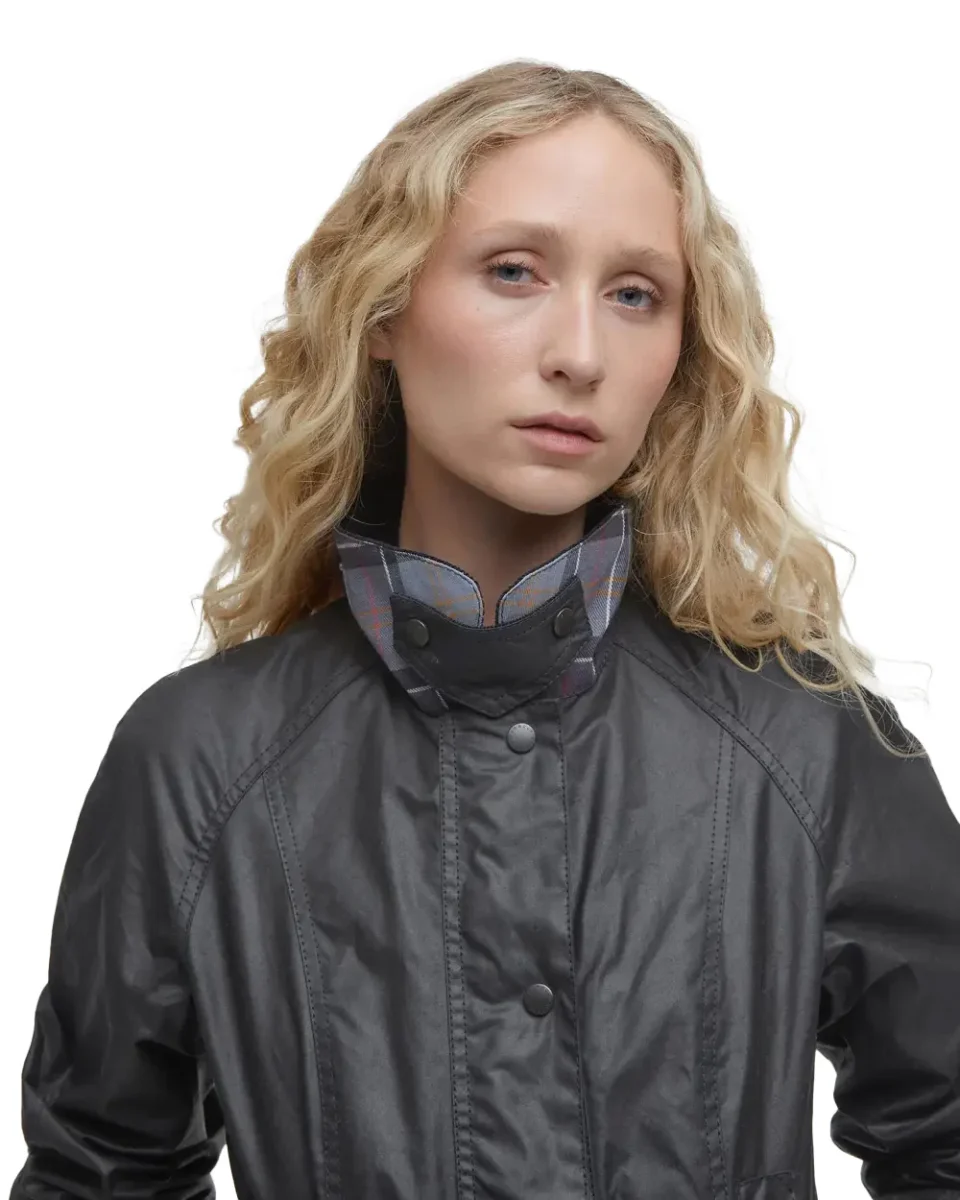Un’icona British reinterpretata per il guardaroba contemporaneo. La Barbour Beadnell Wax Jacket in versione black è la giacca cerata da donna che unisce funzionalità e stile senza tempo. Realizzata in cotone Sylkoil cerato, è resistente all’acqua e perfetta per affrontare la mezza stagione. Il colletto in velluto, la fodera tartan e il taglio femminile la rendono un capo versatile, ideale sia per l’outdoor che per la città.