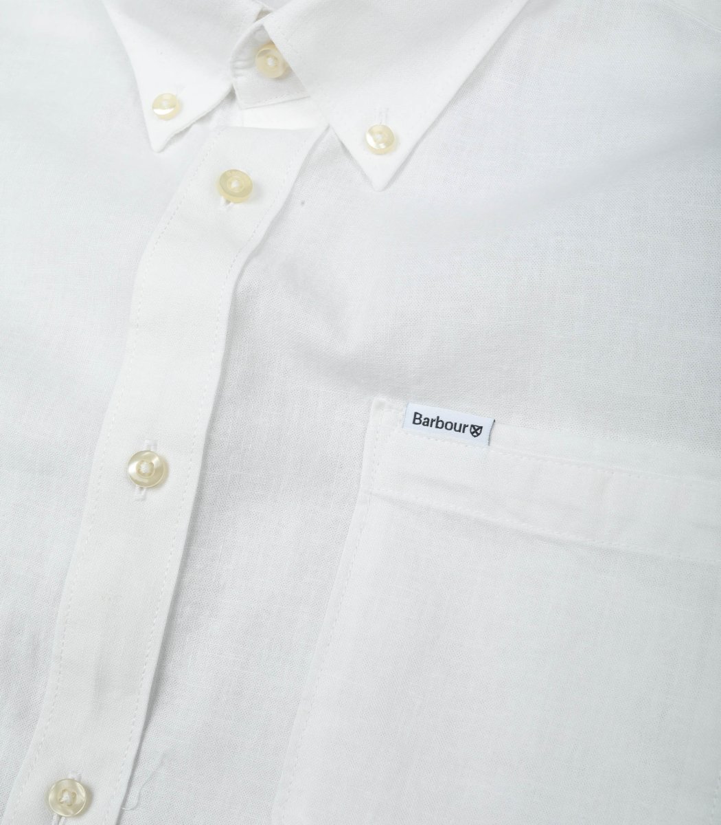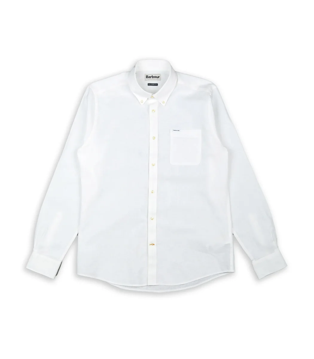 Camicia manica lunga Barbour colore bianco da uomo con bottoni frontali e logo ricamato tessuto in lino.