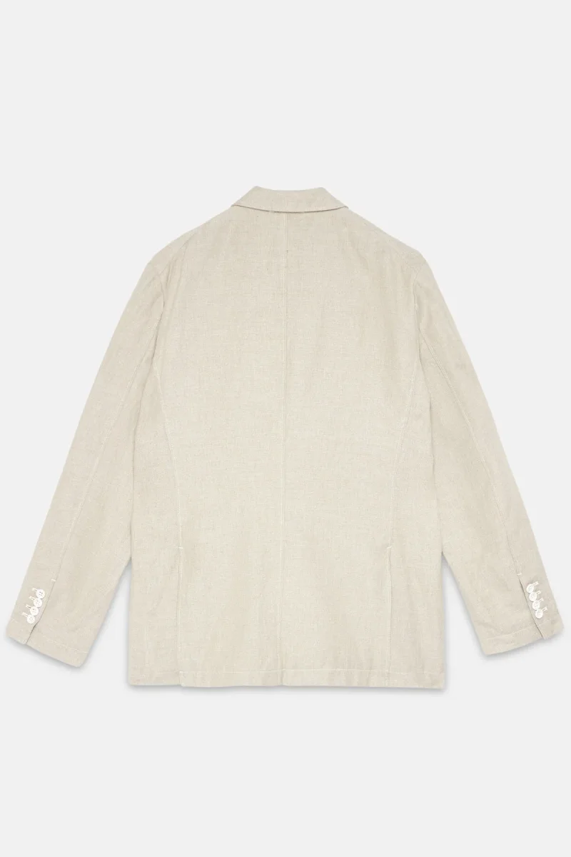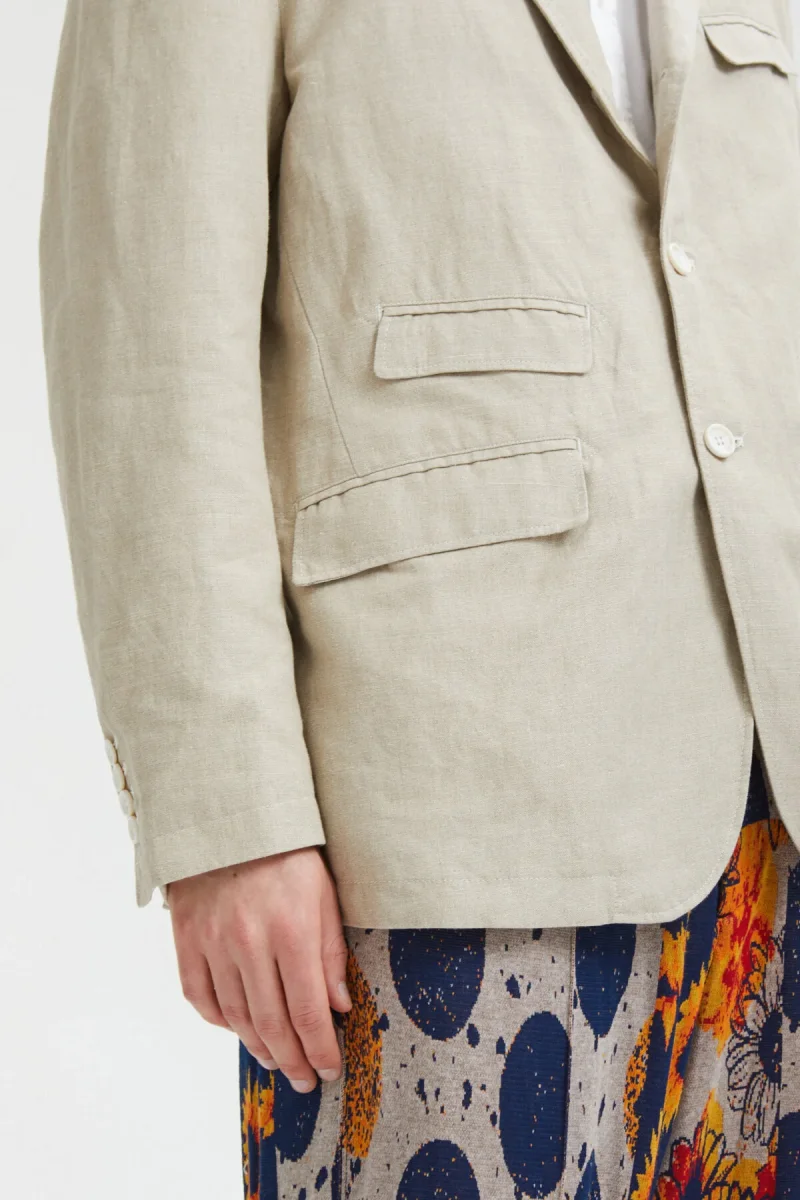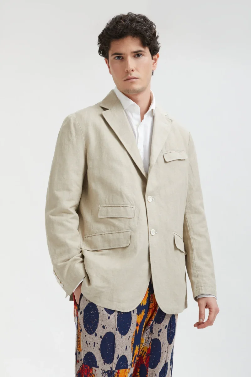Questa giacca presenta quattro tasche con patta, pinces anteriori per una vestibilità più sottile e una chiusura a tre bottoni. Questa stagione la giacca è disponibile in cotone lino naturale, pronta per l’estate.