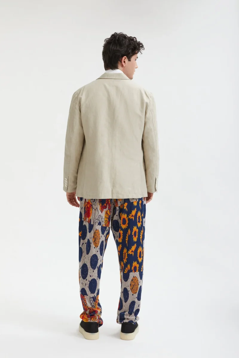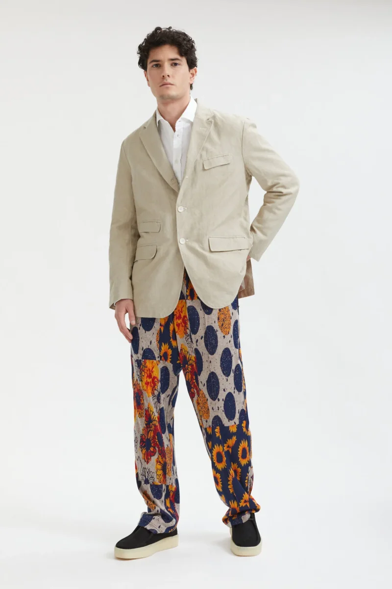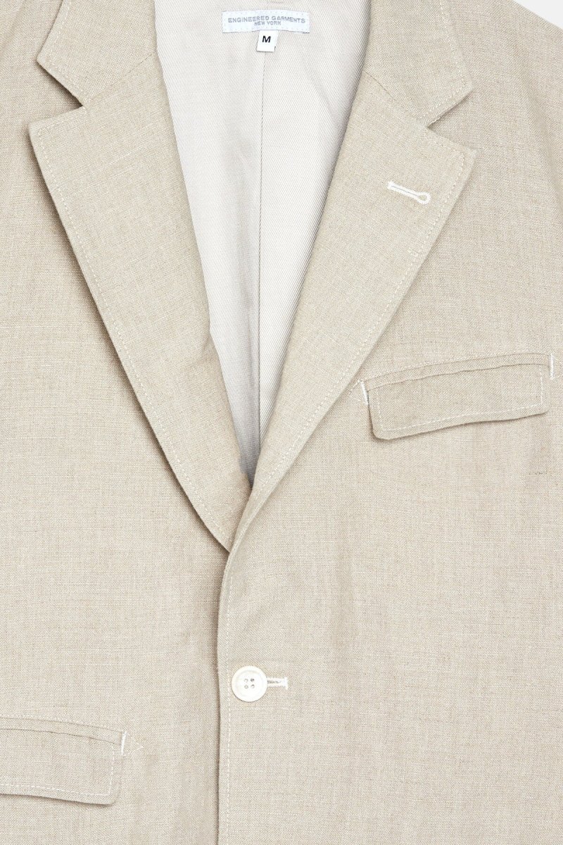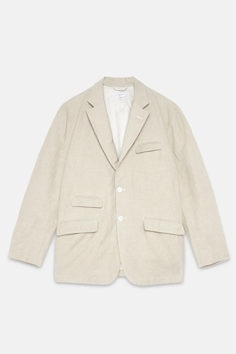 Questa giacca presenta quattro tasche con patta, pinces anteriori per una vestibilità più sottile e una chiusura a tre bottoni. Questa stagione la giacca è disponibile in cotone lino naturale, pronta per l’estate.