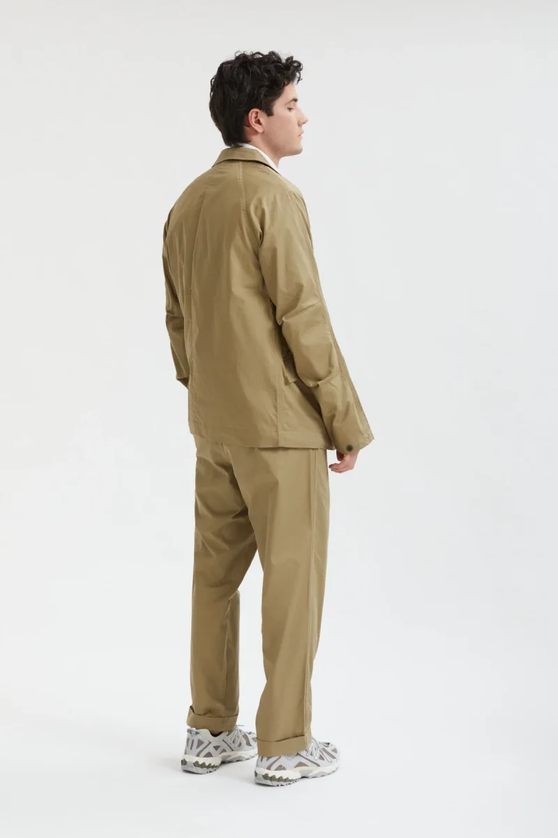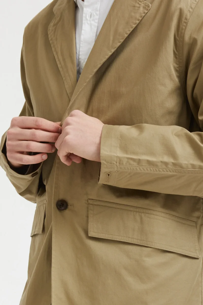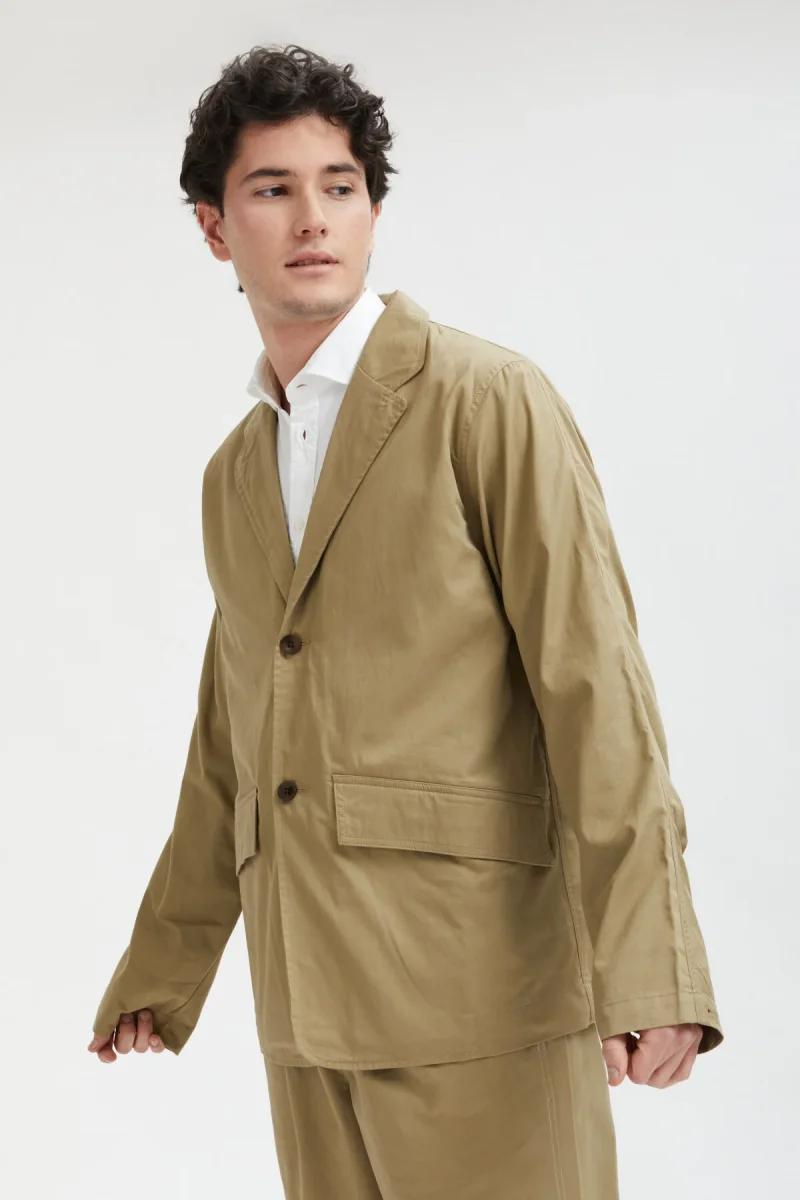 Il blazer di Garbstore è caratterizzato da gomiti plissettati che richiamano le giacche militari americane. Realizzato in cotone, ha una linea morbida con tasche con patta e tasche interne a filetto. Bottoni in corozo chiudono la giacca sul davanti e i polsini.