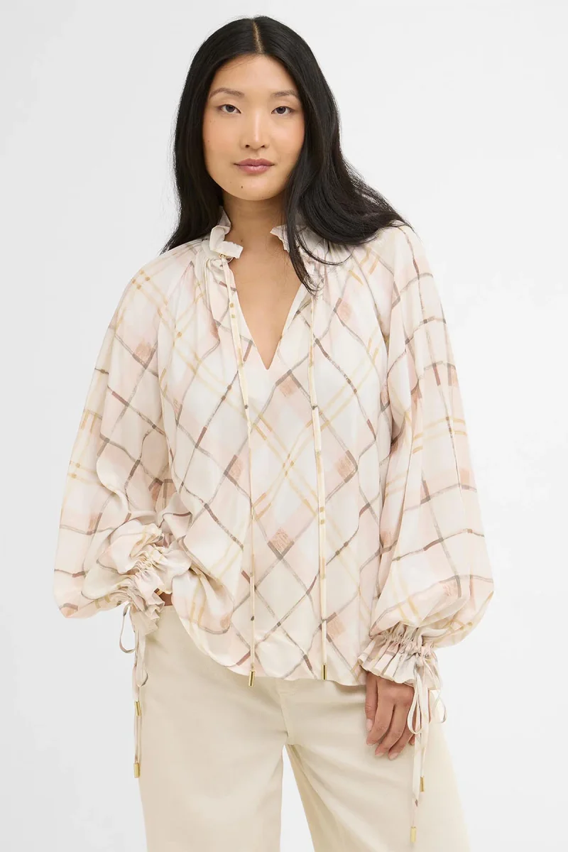 La blusa Asker a quadri con dettagli arricciati di Barbour è realizzata in un tessuto leggero e fluido per offrire una vestibilità comoda. Caratterizzato da un delicato collo arricciato e da una stampa a quadri dipinta a mano, questo capo dona un tocco femminile ai tuoi outfit da tutti i giorni. I lacci in tessuto sul collo e sui polsini, rifiniti da discreti dettagli in metallo, conferiscono un tocco di ricercatezza a questa blusa dal look elegante e disinvolto.