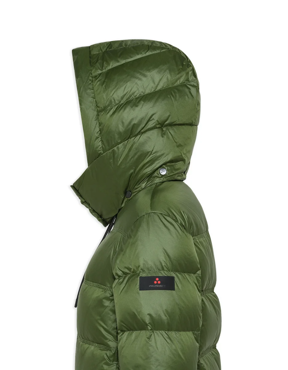Il tessuto è idrorepellente, resistente e morbido. L’imbottitura è in piuma naturale ed la lunghezza è corta con doppio cappuccio uno fisso ed uno staccabile.