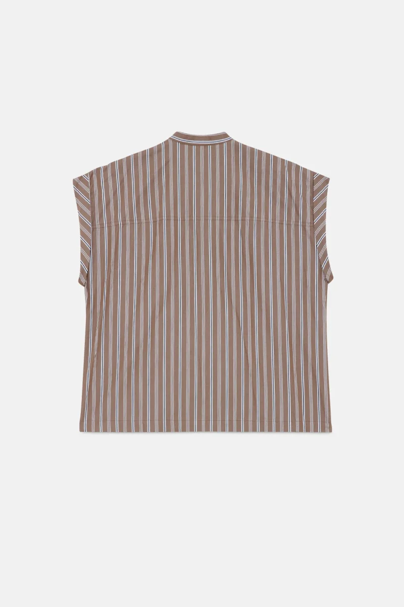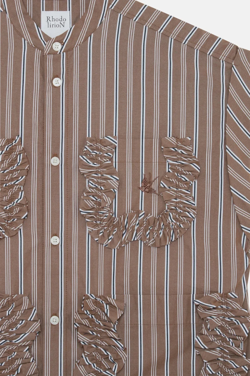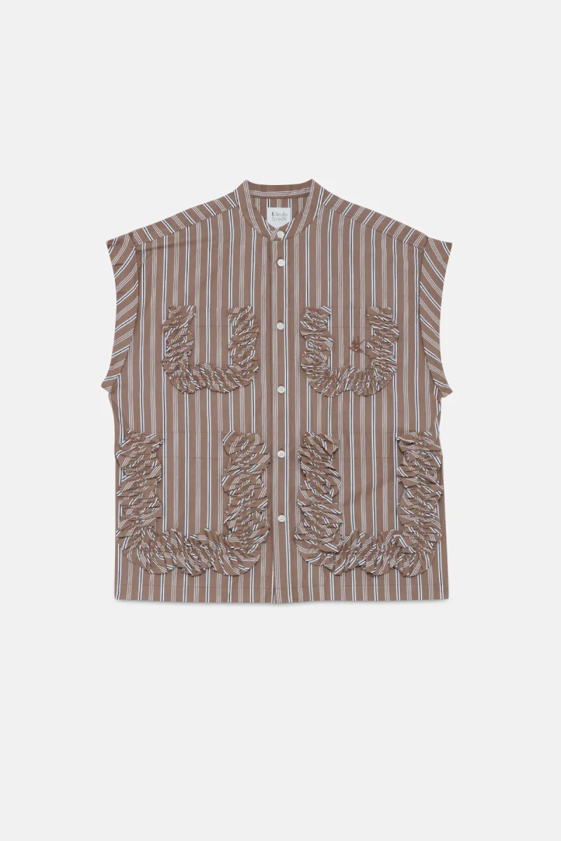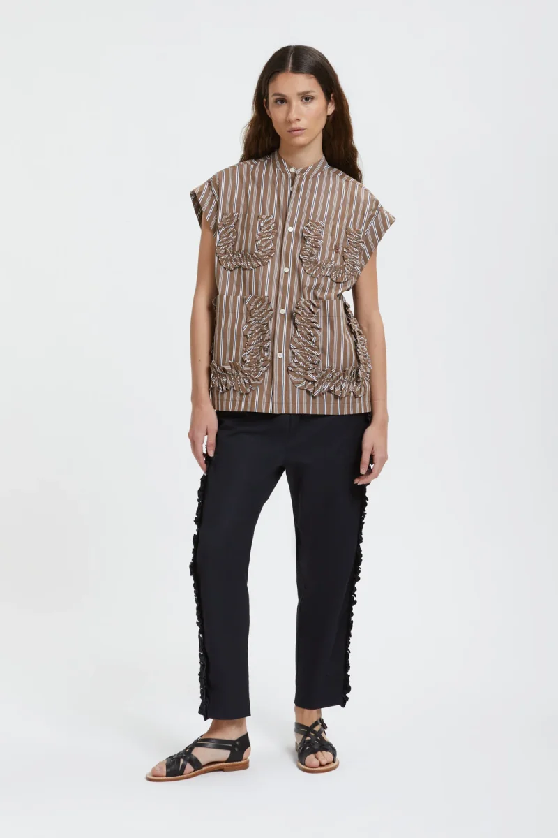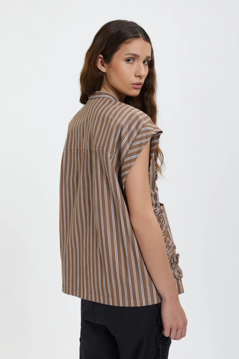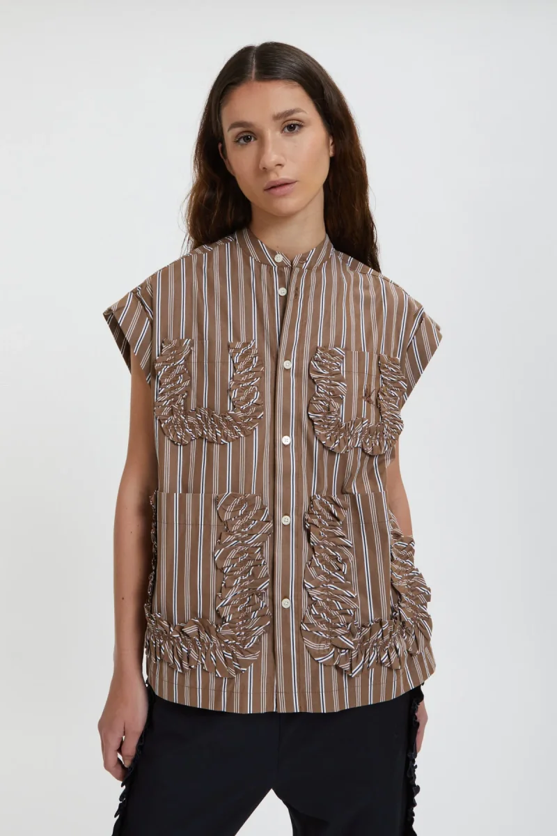 Questa camicia con maniche alla francese è caratterizzata da tasche con volant che ne accentuano il design. Il materiale utilizzato è un tessuto lavoato a macchina in cotone a trama fitta. Può essere indossata come gilet o abbinata a pantaloni dello stesso materiale.