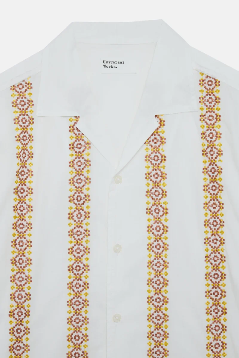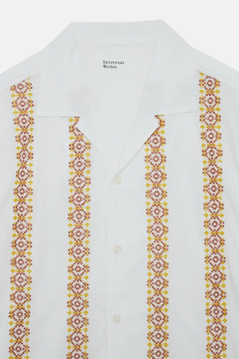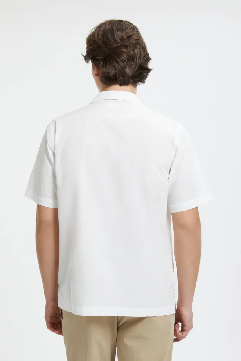 La camicia Minari di Universal Works a maniche corte si ispira all’estetica anni ’50 e ’60, da cui riprende il taglio e il colletto.