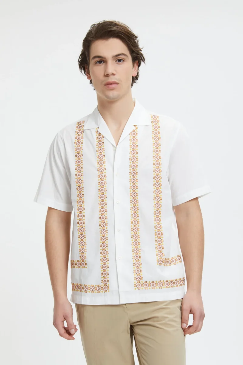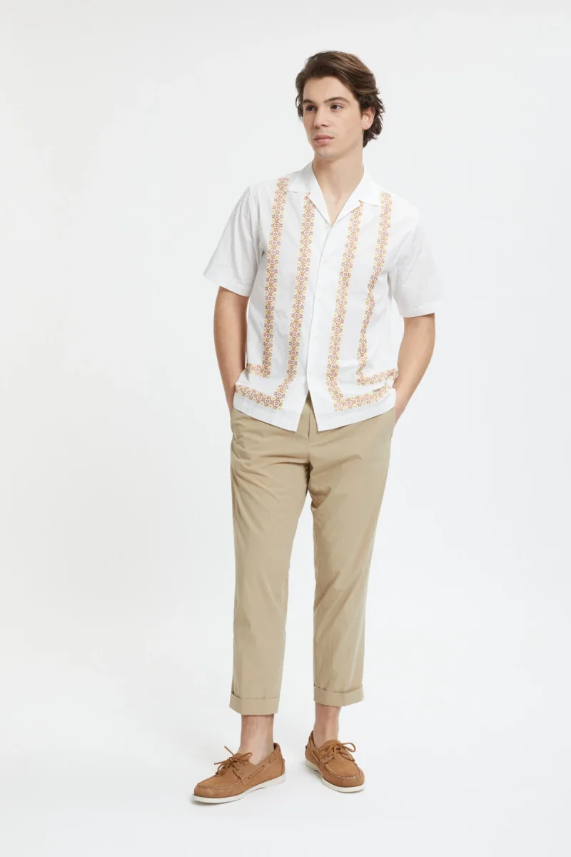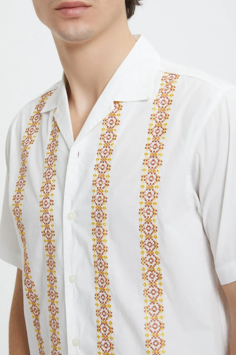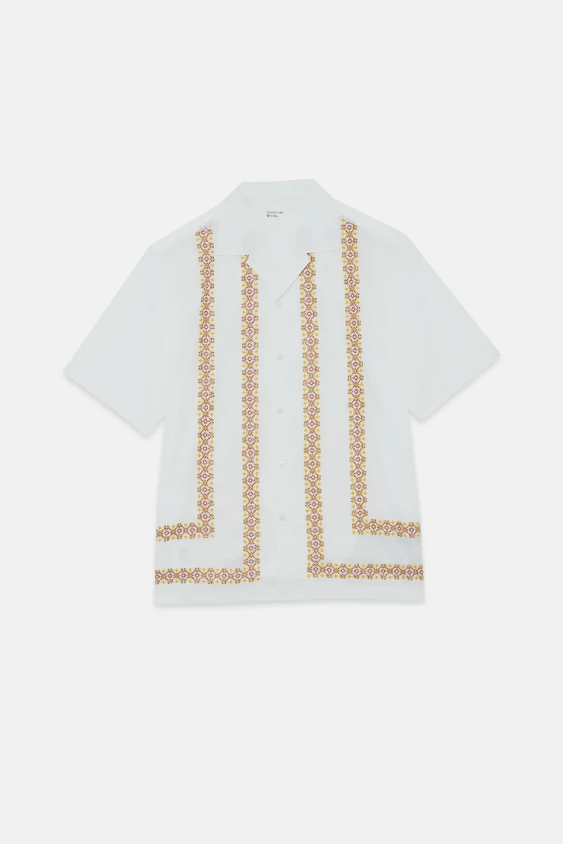 La camicia Minari di Universal Works a maniche corte si ispira all’estetica anni ’50 e ’60, da cui riprende il taglio e il colletto.