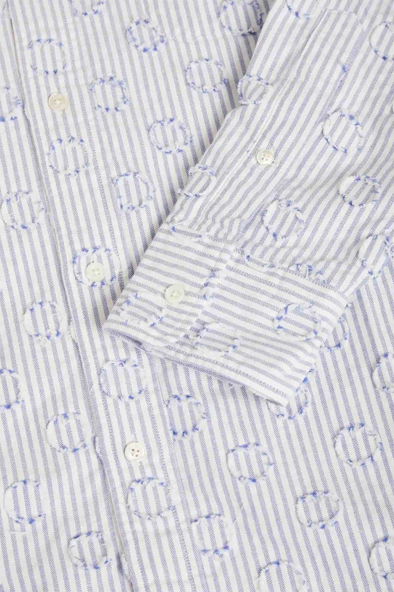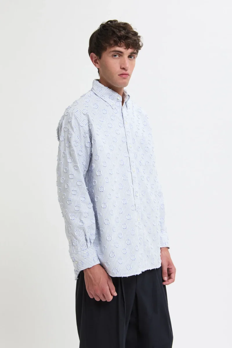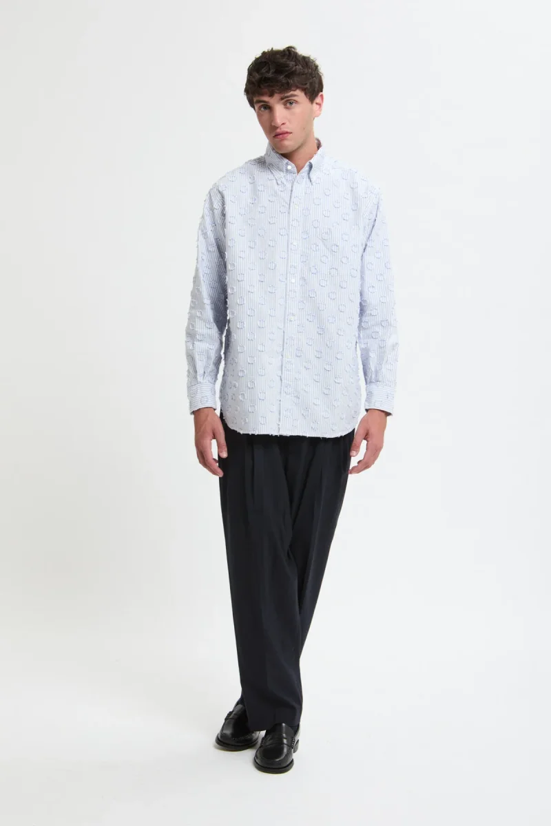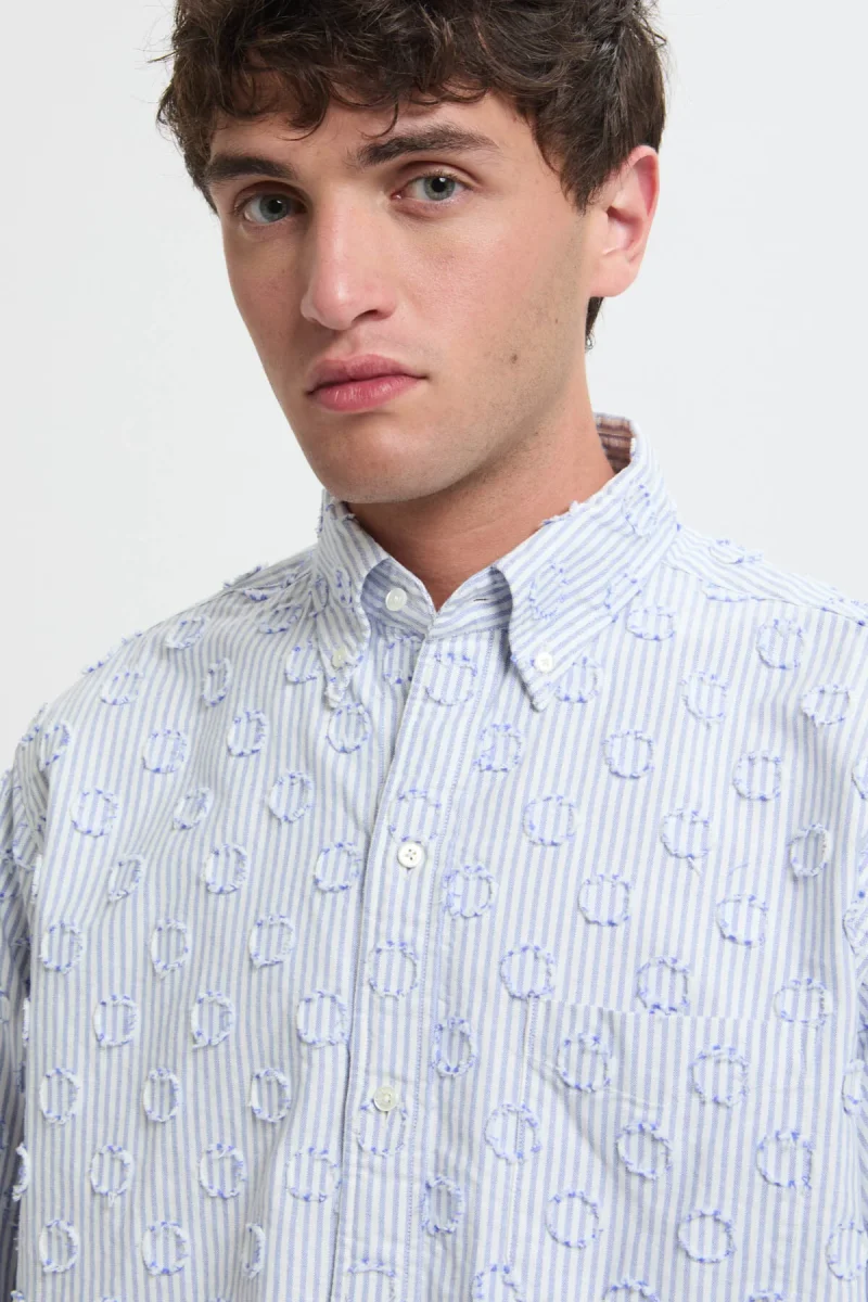 Questa camicia BEAMS PLUS con chiusura a bottoni si distingue per il suo tessuto con motivo a pois e dettagli sfrangiati. I sei bottoni frontali, leggermente sfalsati, donano un tocco di originalità mantenendo un’eleganza classica. La lunghezza generosa e l’esclusiva silhouette a trapezio completano il design, rendendola un capo raffinato e distintivo.