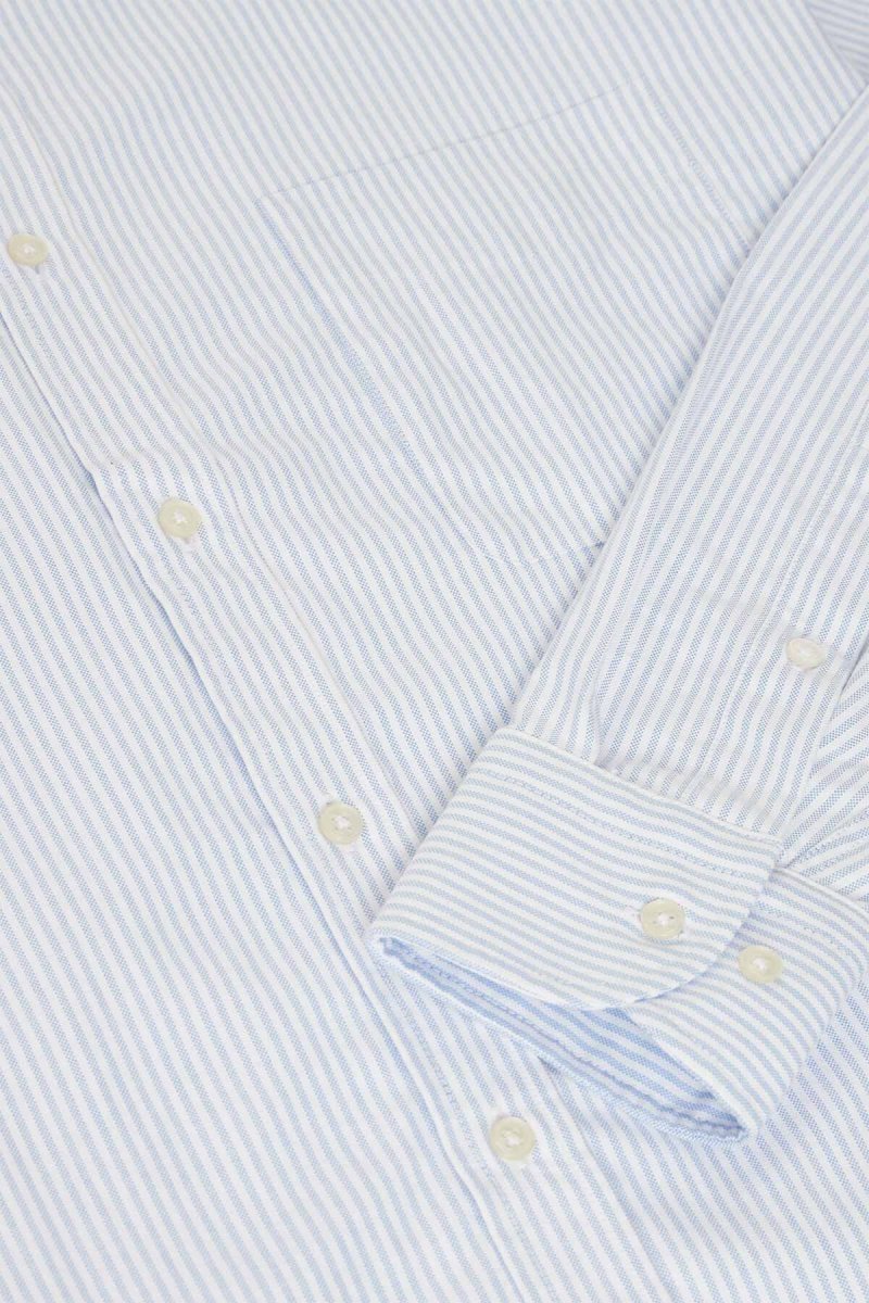 Realizzata in un cotone morbido e traspirante, questa camicia offre un comfort naturale e uno stile senza tempo. Il motivo a sottili righe azzurre su fondo bianco aggiunge un tocco di eleganza discreta, ideale per un look raffinato ma versatile.