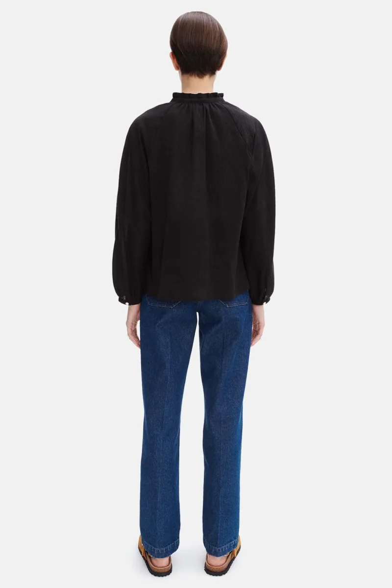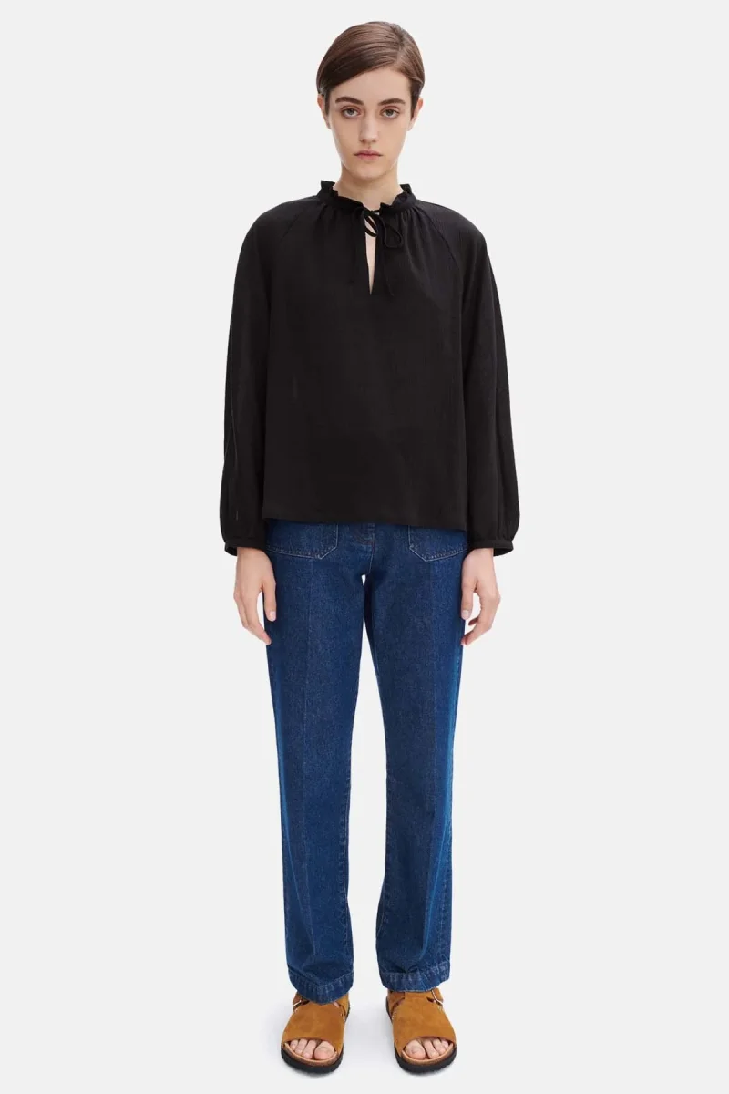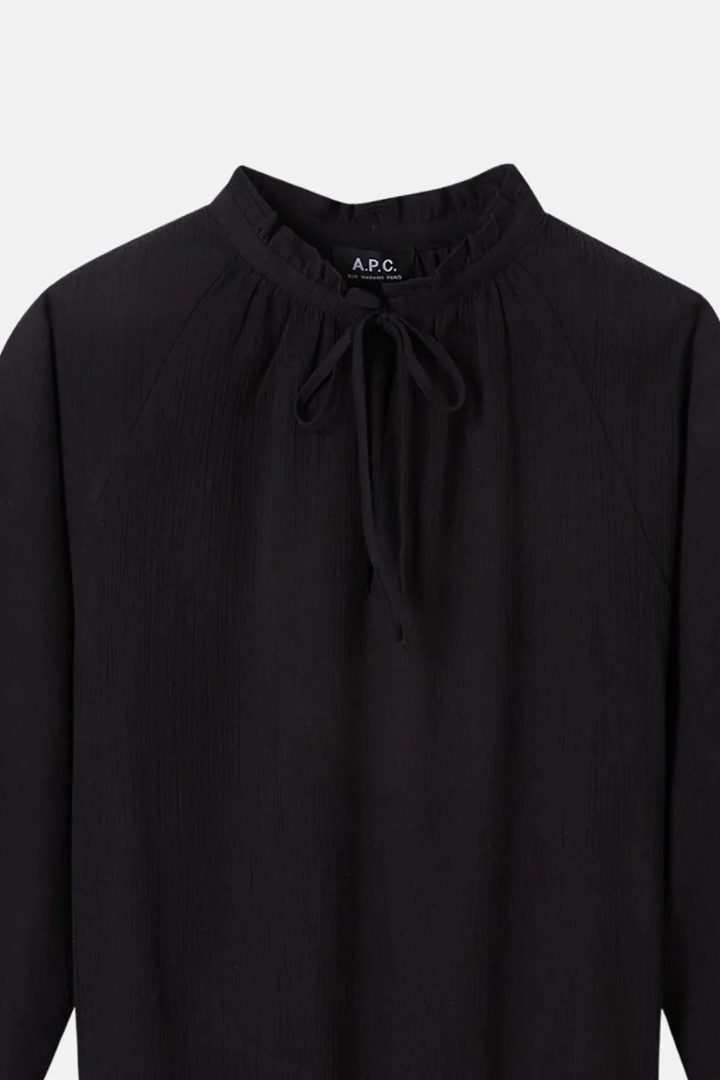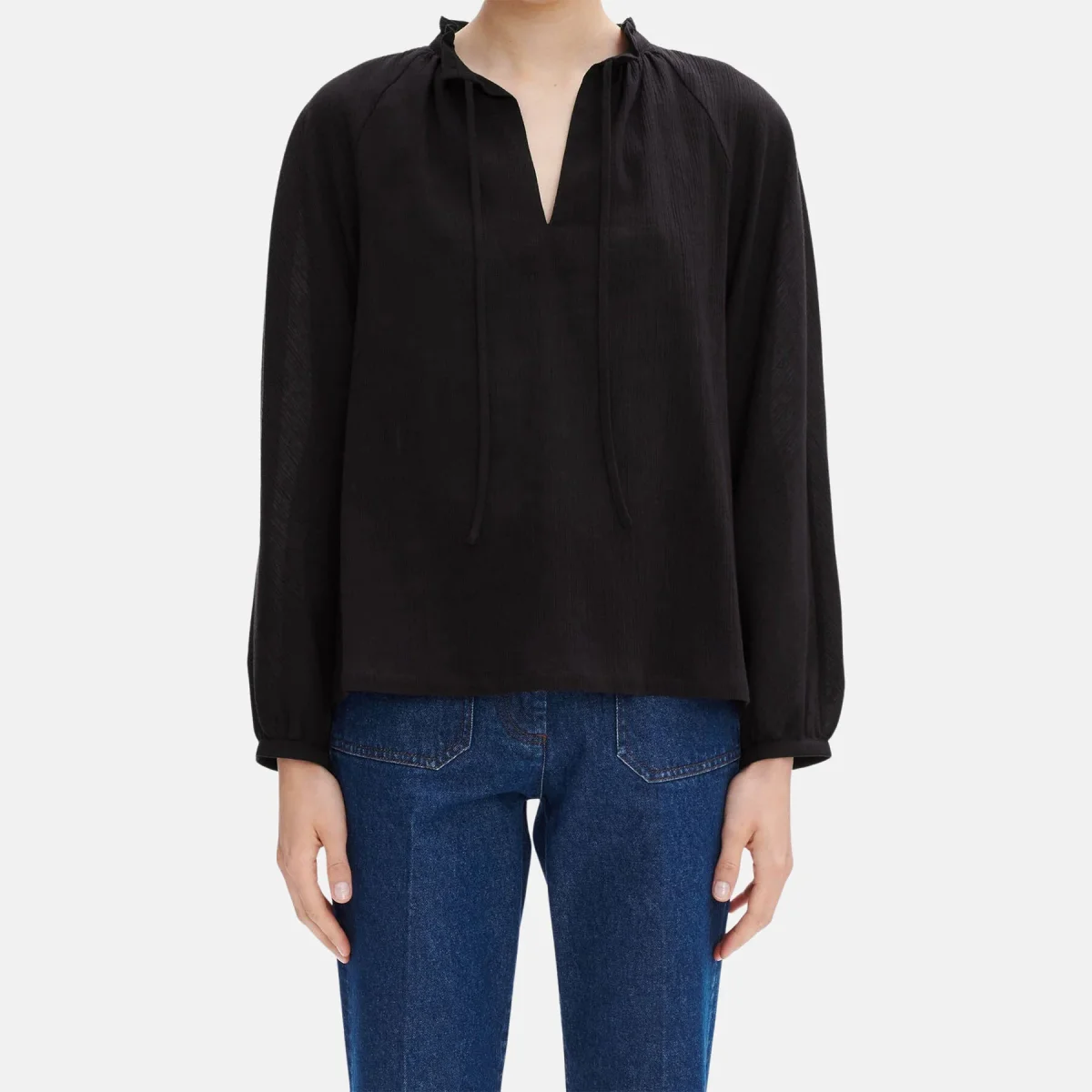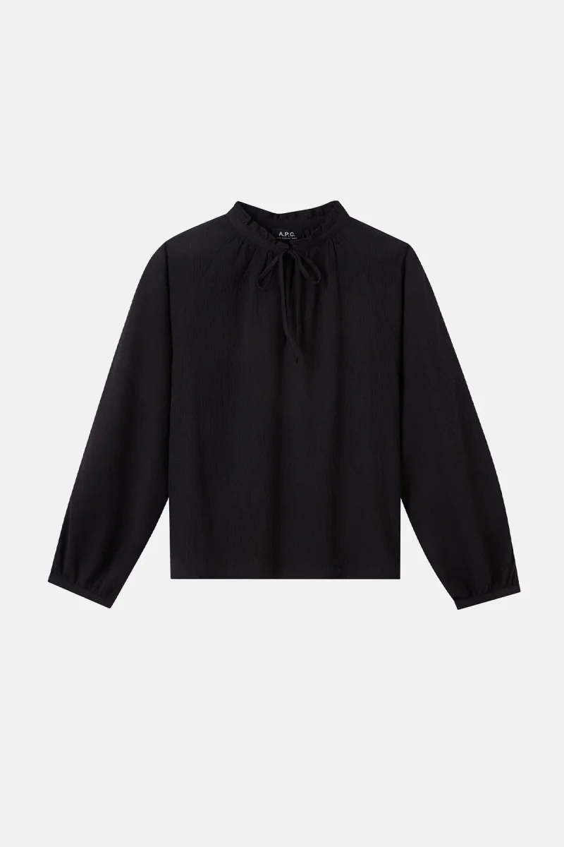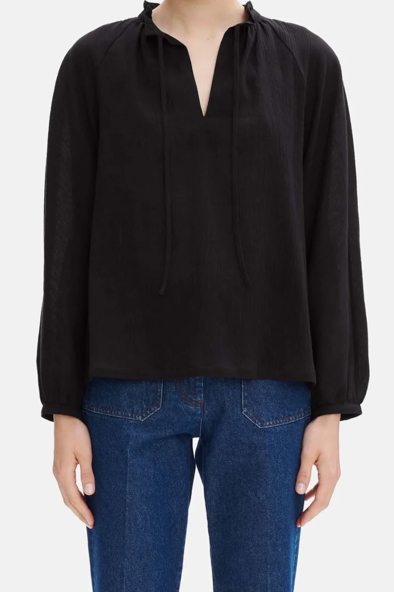 Camicetta a maniche lunghe con fiocco, polsini, scollo a V e motivi plissettati.
