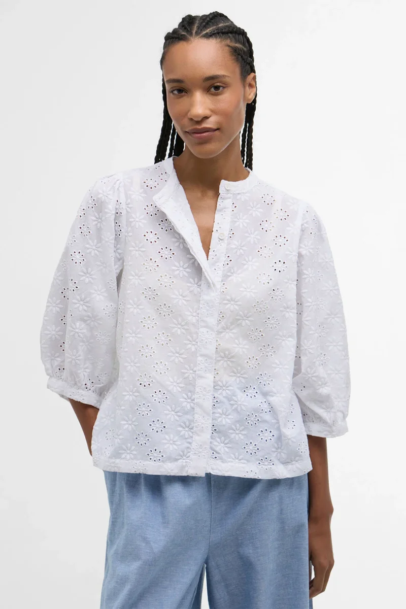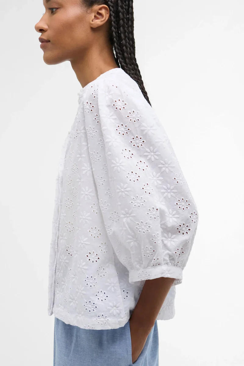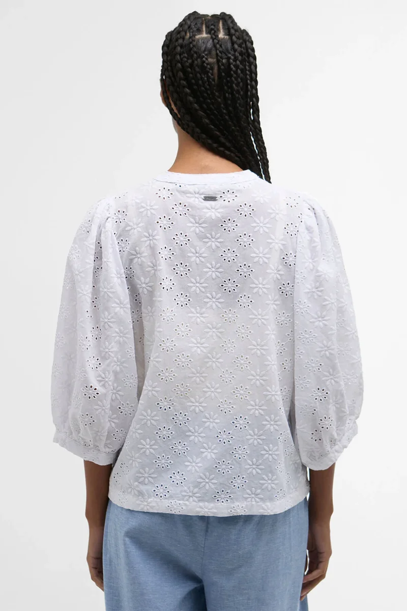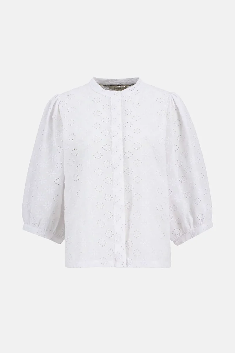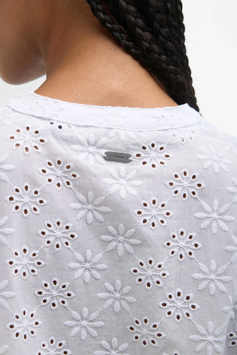 La camicia Layla in pizzo sangallo di Barbour infonde un tocco romantico al tuo outfit da tutti i giorni. Realizzato in delicato pizzo sangallo, il capo presenta ampie maniche lunghe fino al gomito e una semplice abbottonatura nascosta che regala il giusto pizzico di raffinatezza. La camicia è impreziosita da un bottone con logo in finto corno sul colletto, mentre la sottile barretta identificativa sul retro del collo completa il look con l’iconico fascino di Barbour.