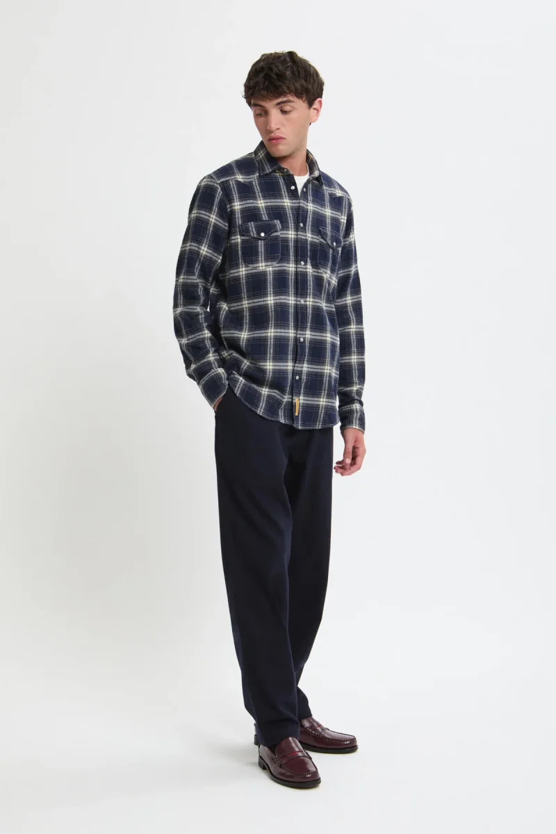 Un classico intramontabile che unisce stile e carattere. La fantasia a quadri nei toni del blu e del panna dona un fascino autentico, perfetto per chi ama un look casual ma curato nei dettagli.