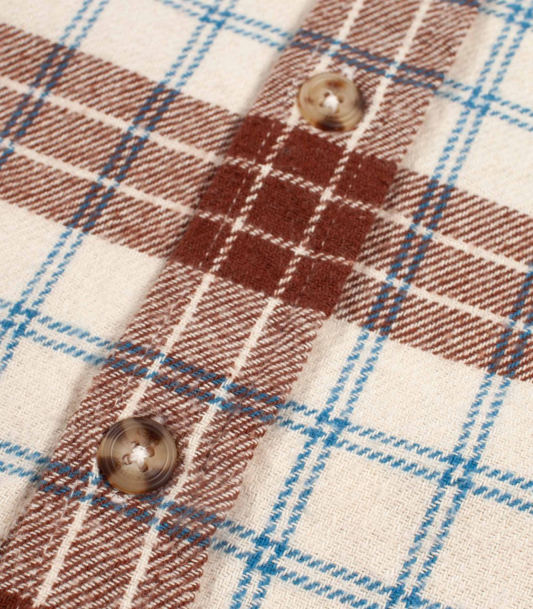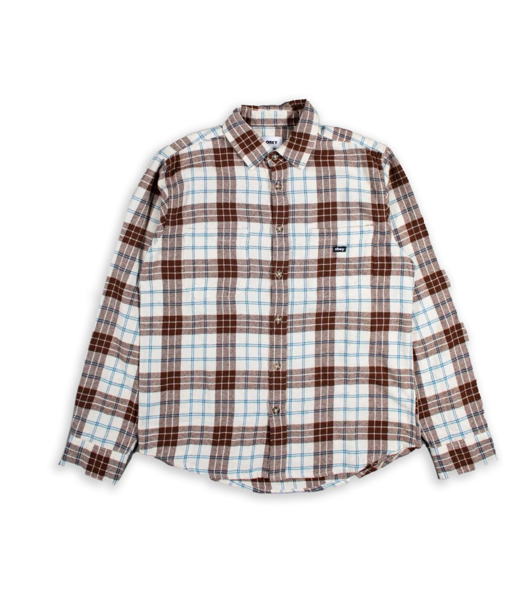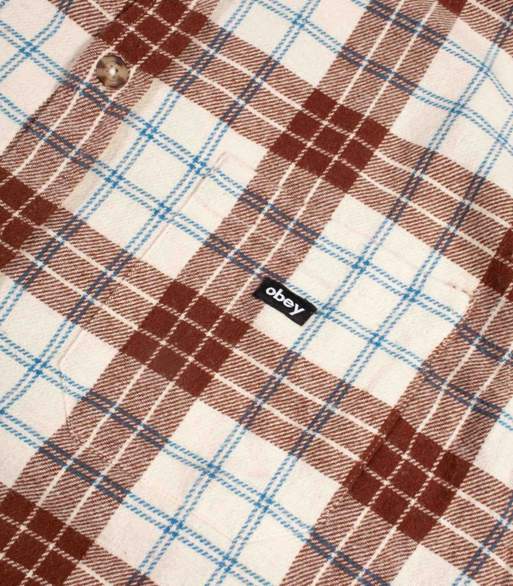 Camicia manica lunga Obey beige a sacchi tessuto flanella chiusura frontale a bottoni patch logo frontale.