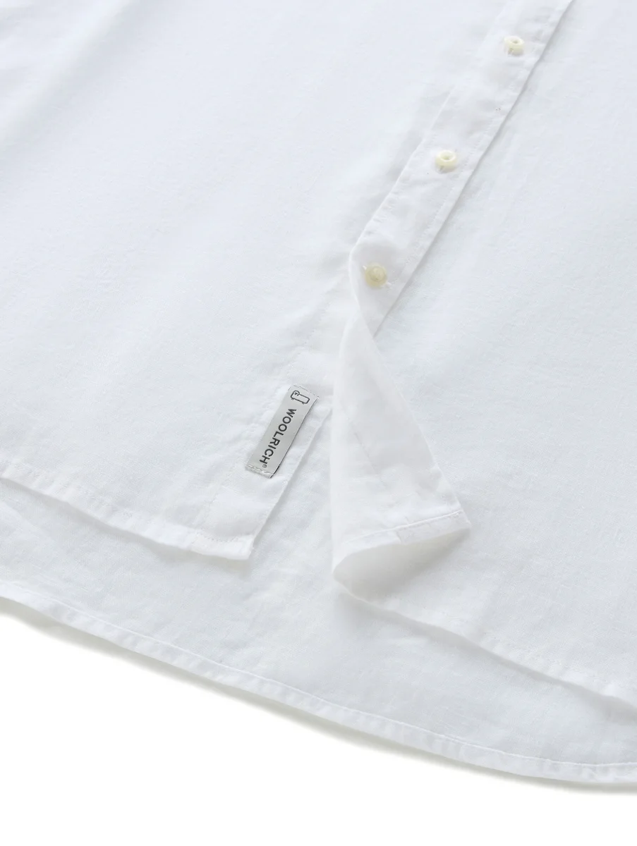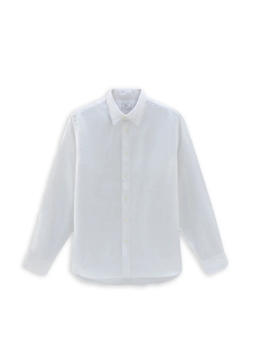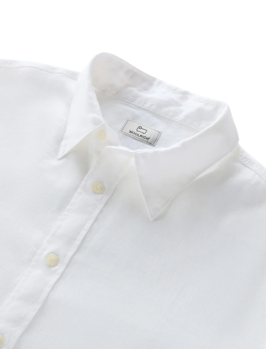 Camicia manica lunga Woolrich modello lino linen colore bianco da uomo con bottoni frontali in morbido lino fit regolare.