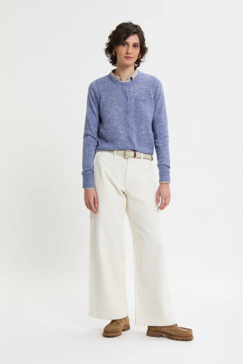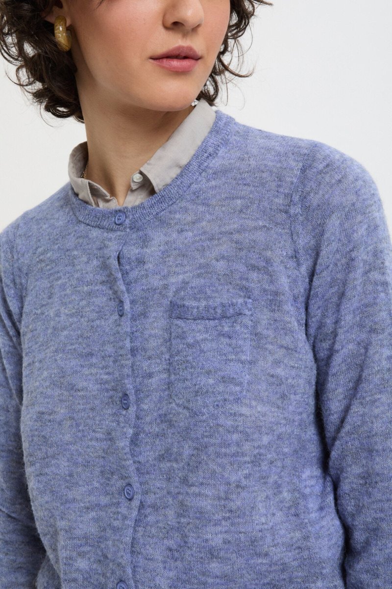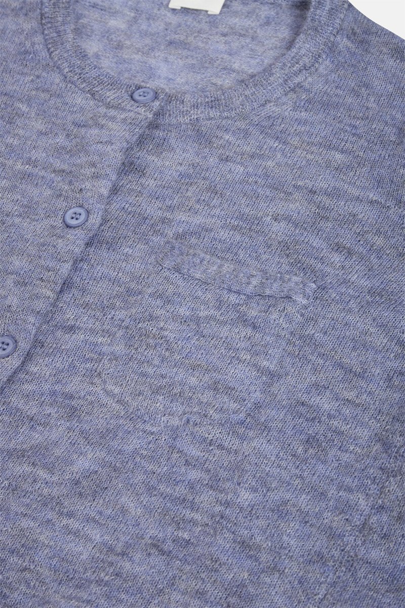 Realizzato in alpaca, questo cardigan offre una sensazione di leggerezza, morbidezza e calore al tatto, pur presentando una leggera trasparenza. Il modello ha un taglio moderatamente aderente che non enfatizza eccessivamente le linee del corpo, garantendo una vestibilità confortevole e versatile. Un piccolo taschino sul petto sinistro rappresenta un dettaglio essenziale, aggiungendo un tocco di funzionalità e stile al capo.
