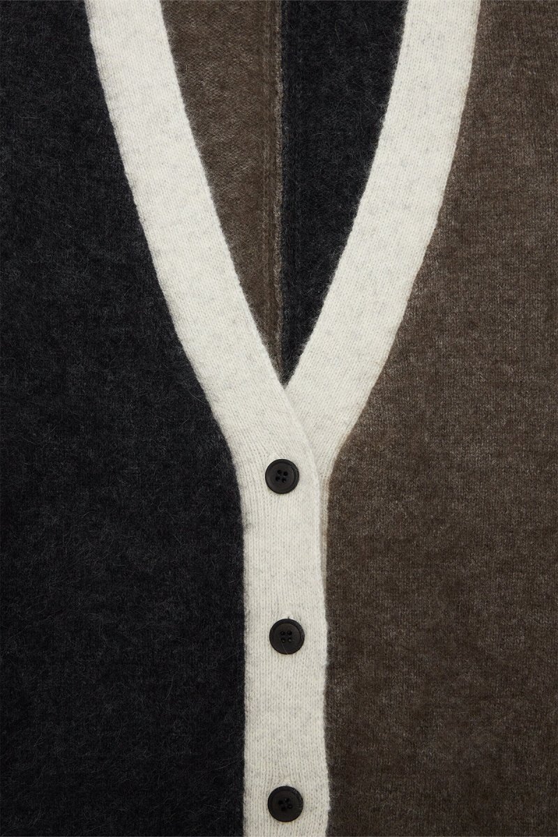Cardigan con scollo a V, a maniche lunghe, interamente realizzato in morbida lana di procione. Il fondo, i polsini e lo scollo presentano una lavorazione a costine.