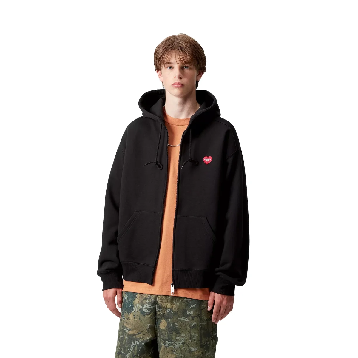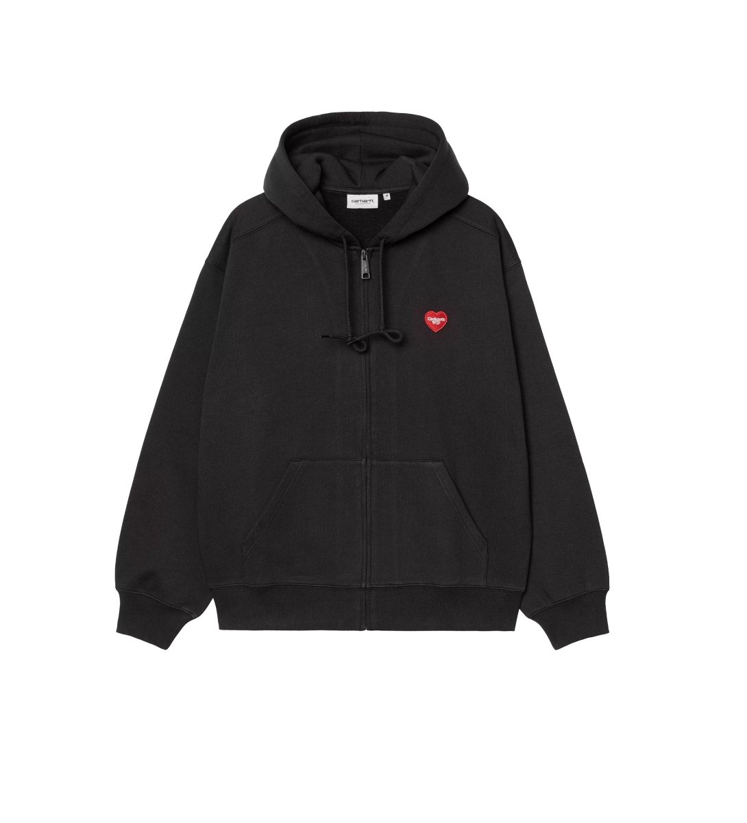 Iconografia street e DNA workwear. La Hooded Heart II Hartt Sweat Jacket di Carhartt WIP è una felpa con zip dal fit rilassato, realizzata in misto cotone pesante con interno spazzolato. Il cappuccio regolabile e la stampa grafica “Heart II Hartt” sul petto donano un twist creativo al classico look utility. Perfetta per completare outfit streetwear con personalità.