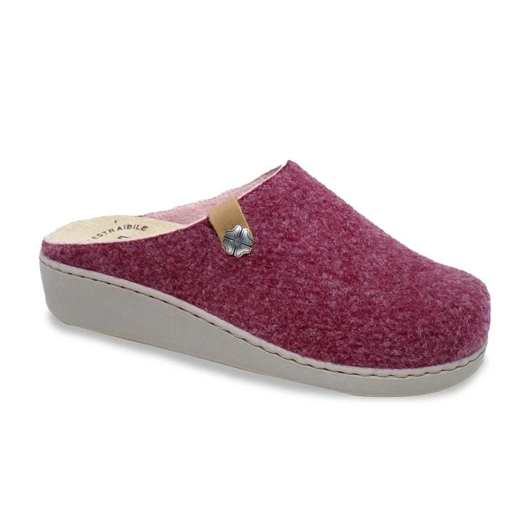 Elegante e calda, la ciabatta con tomaia in lana cotta Bordeaux mantiene i piedi al caldo con stile. Il plantare anatomico estraibile e il sottopiede in vera pelle offrono un supporto ideale, mentre la suola antiscivolo e la zeppa da 4 cm assicurano stabilità e comfort durante tutto il giorno. Calzata leggermente abbondante sul collo del piede, non adatta per piedi affusolati.