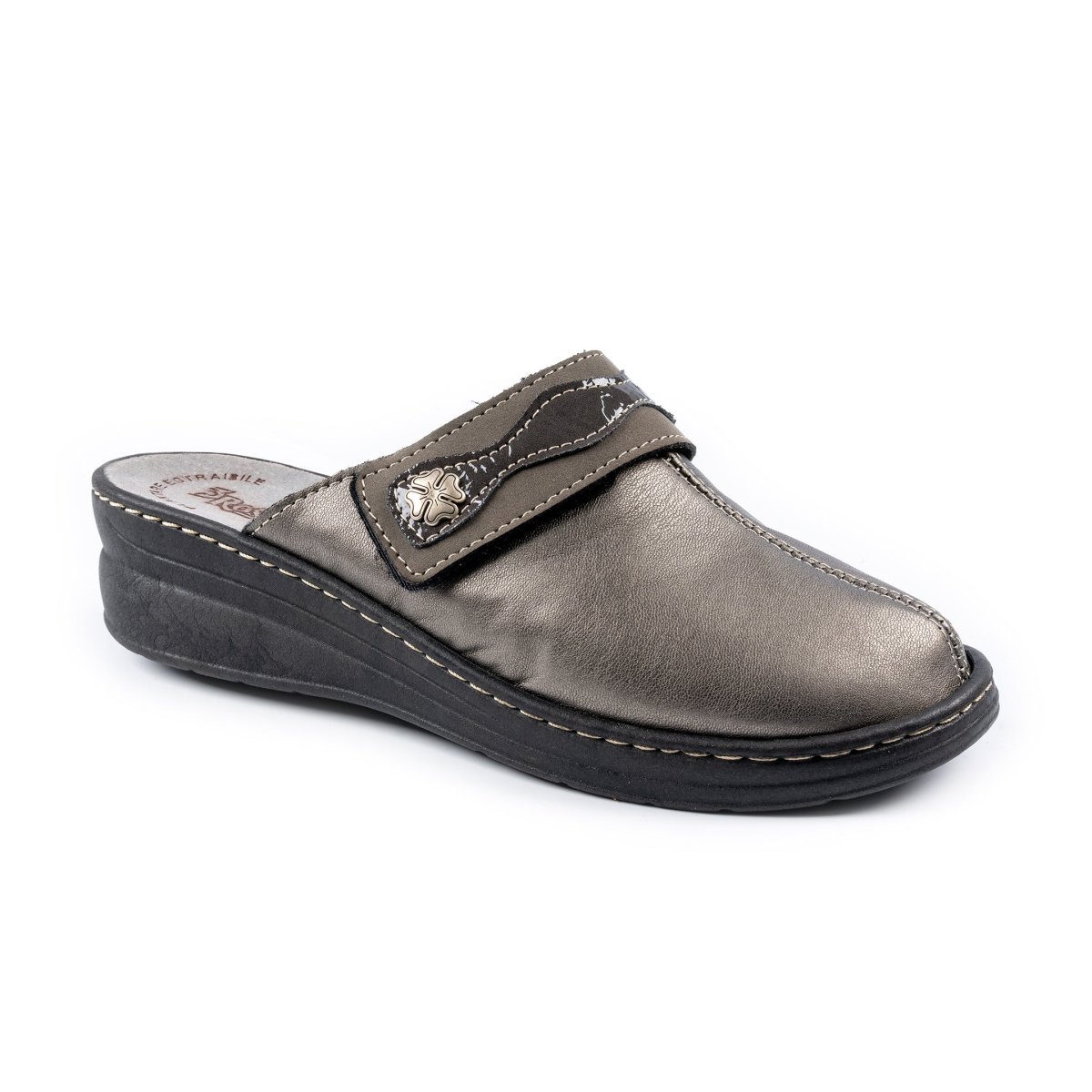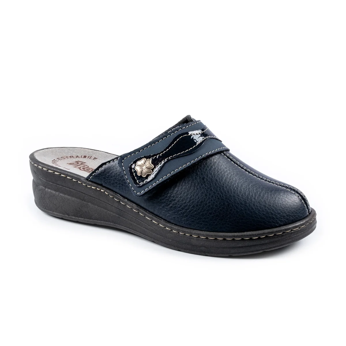 Comoda e pratica, la ciabatta con tomaia stretch adattiva in ecopelle offre una calzata confortevole. La fodera in licra e il velcro regolabile garantiscono una calzata sicura, mentre il plantare anatomico estraibile, dove è possibile sostituirlo con un vostro plantare ortopedico e il sottopiede in pelle assicurano supporto e benessere. La suola antiscivolo e la zeppa da 4,5 cm offrono stabilità e leggerezza. Disponibile nei colori blu, bordeaux e piombo.