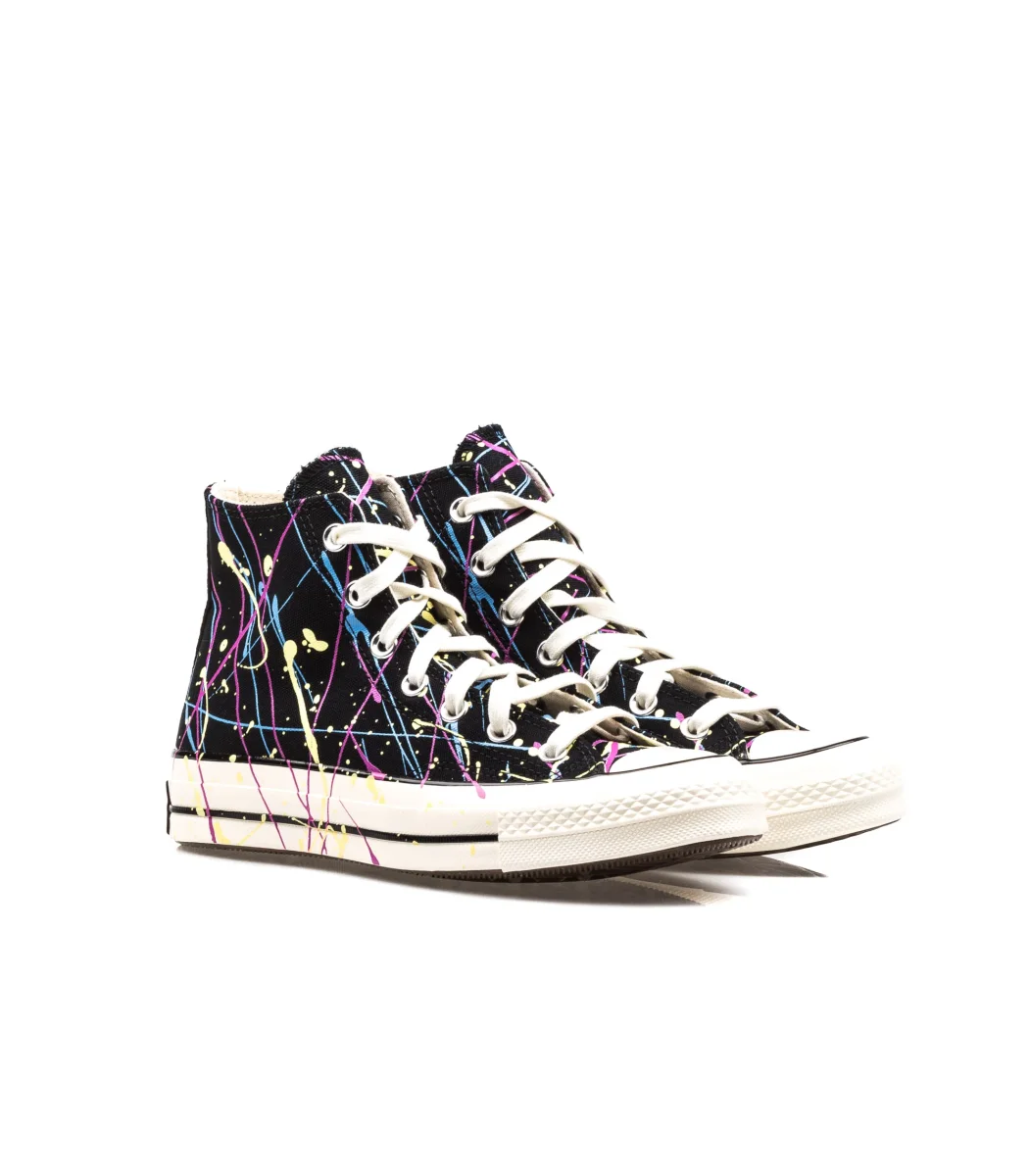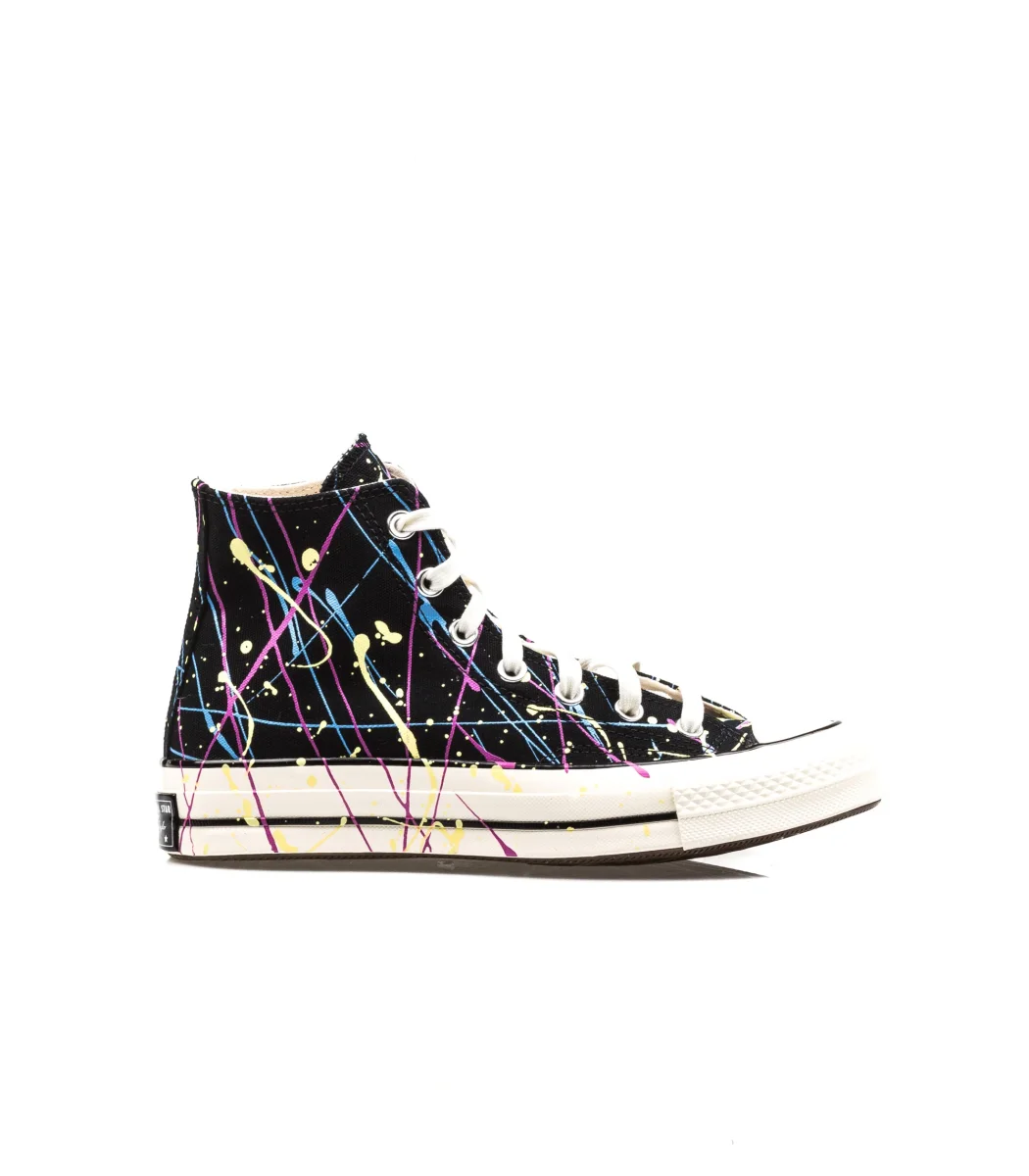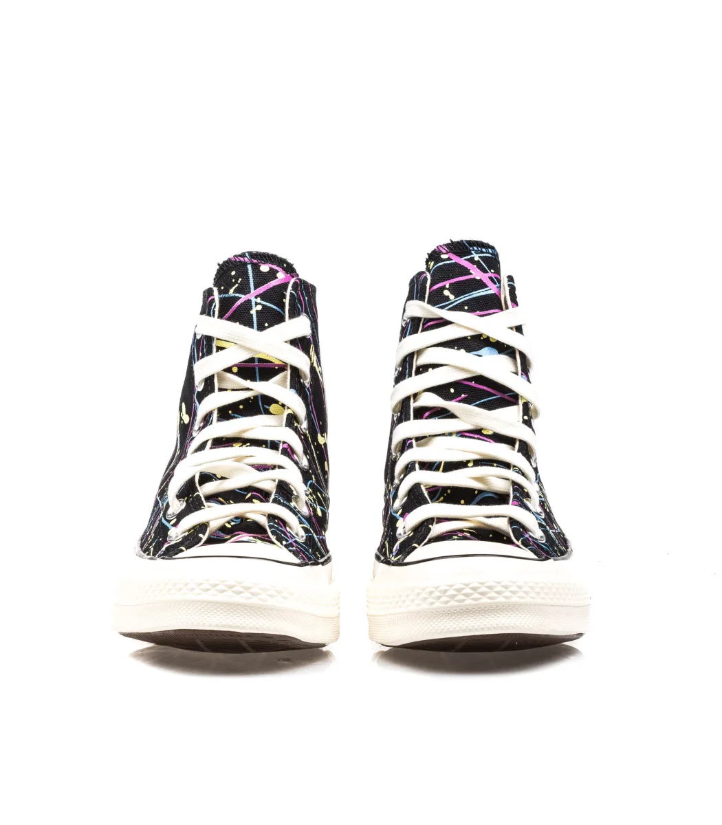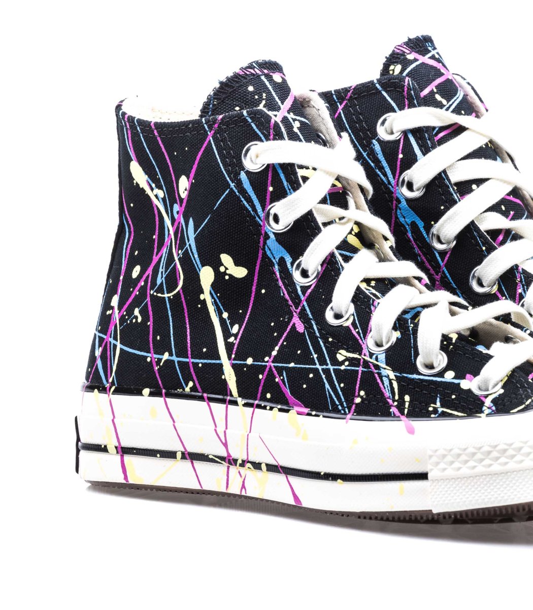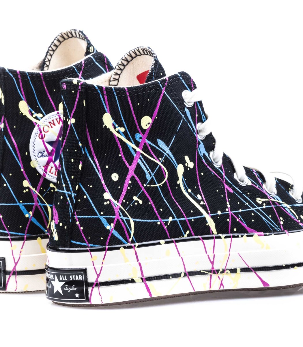 Sneakers Converse chuck 70 archive paint splatter print black alte unisex. Le inconiche Converse vengono ridisegnate per diventare le All Star Chuck 70, con dettagli più moderni e resistenti, come le cuiciture e la punta in gomma più spessa. Anche la suola presenta un’ammortizzazione migliore per dare ancora più comfort senza rinunciare allo stile.