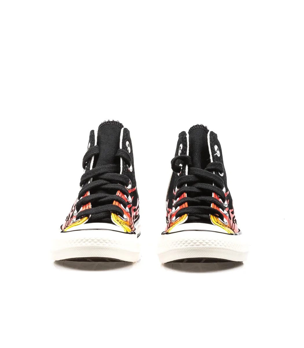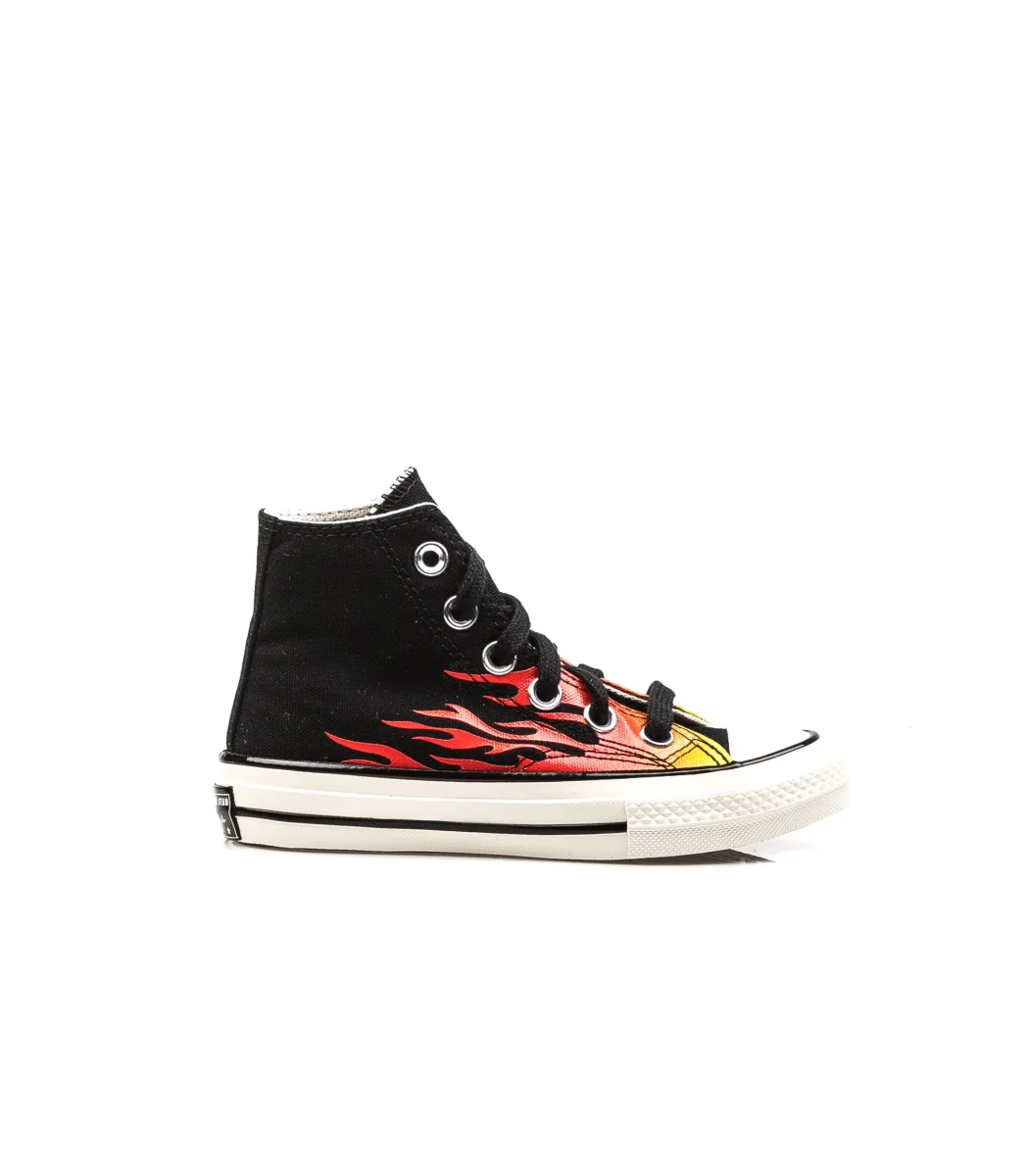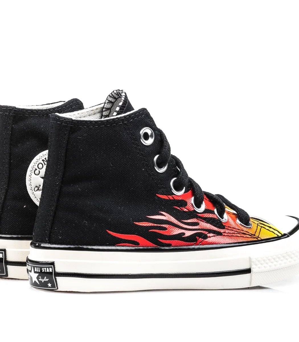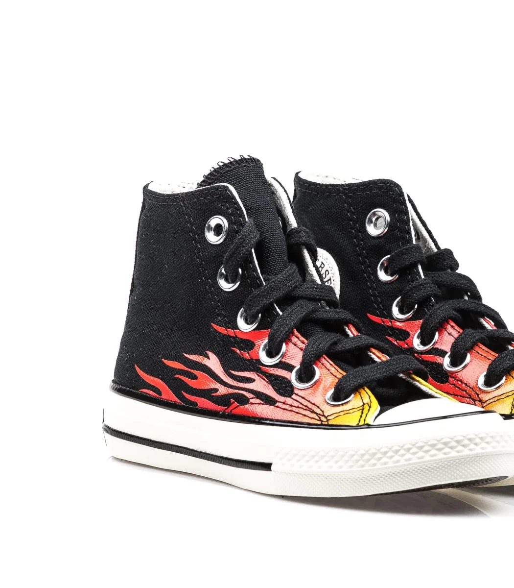 Converse Chuck 70 colore nero da bambino con dettaglio fiamme sulla tomaia.