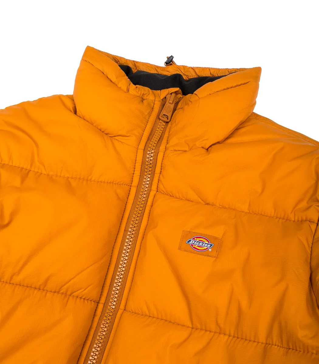 Piumino Dickies colore arancio da uomo con imbottitura interna zip frontale con patch logo ricamato e tasche laterali.