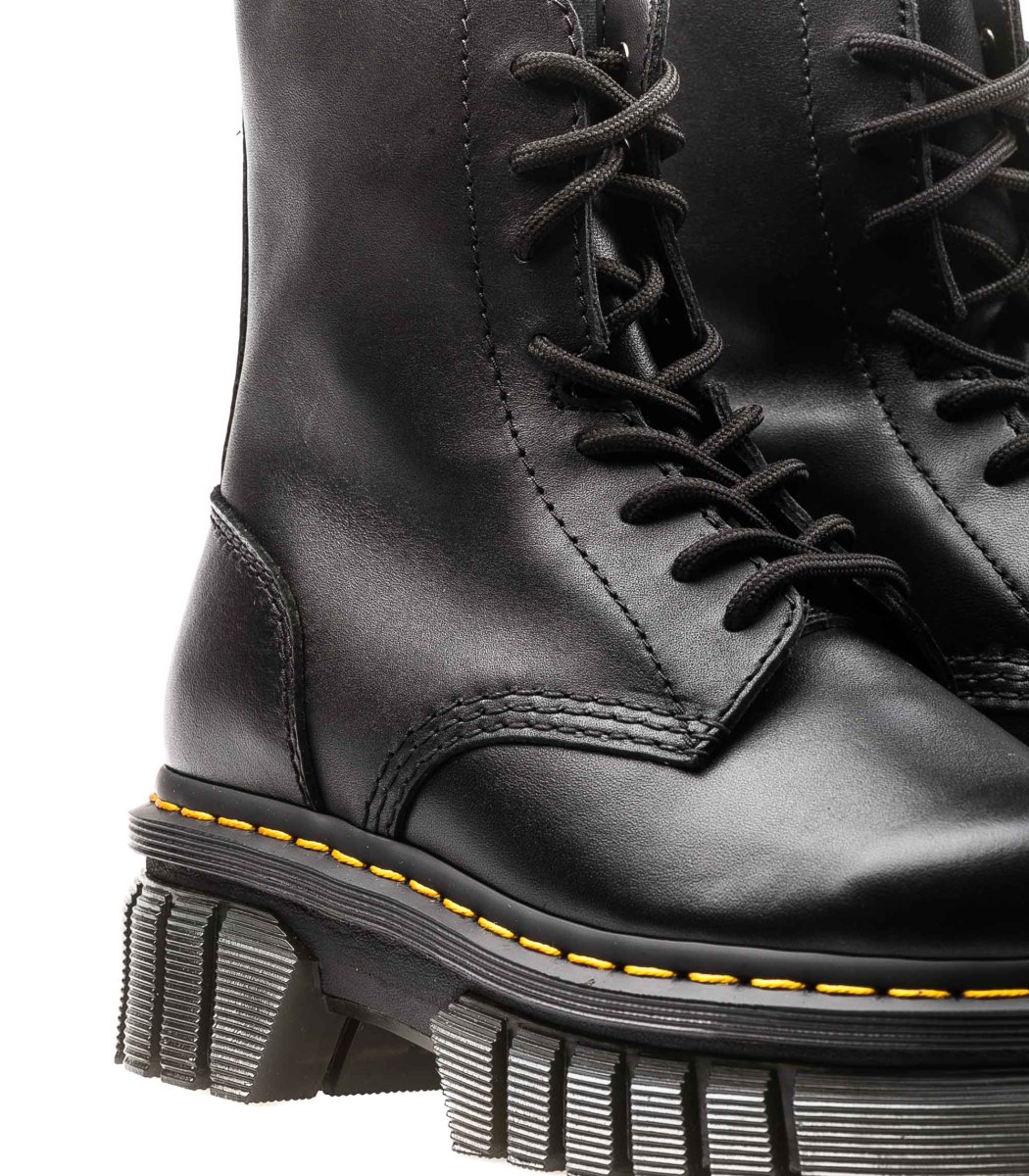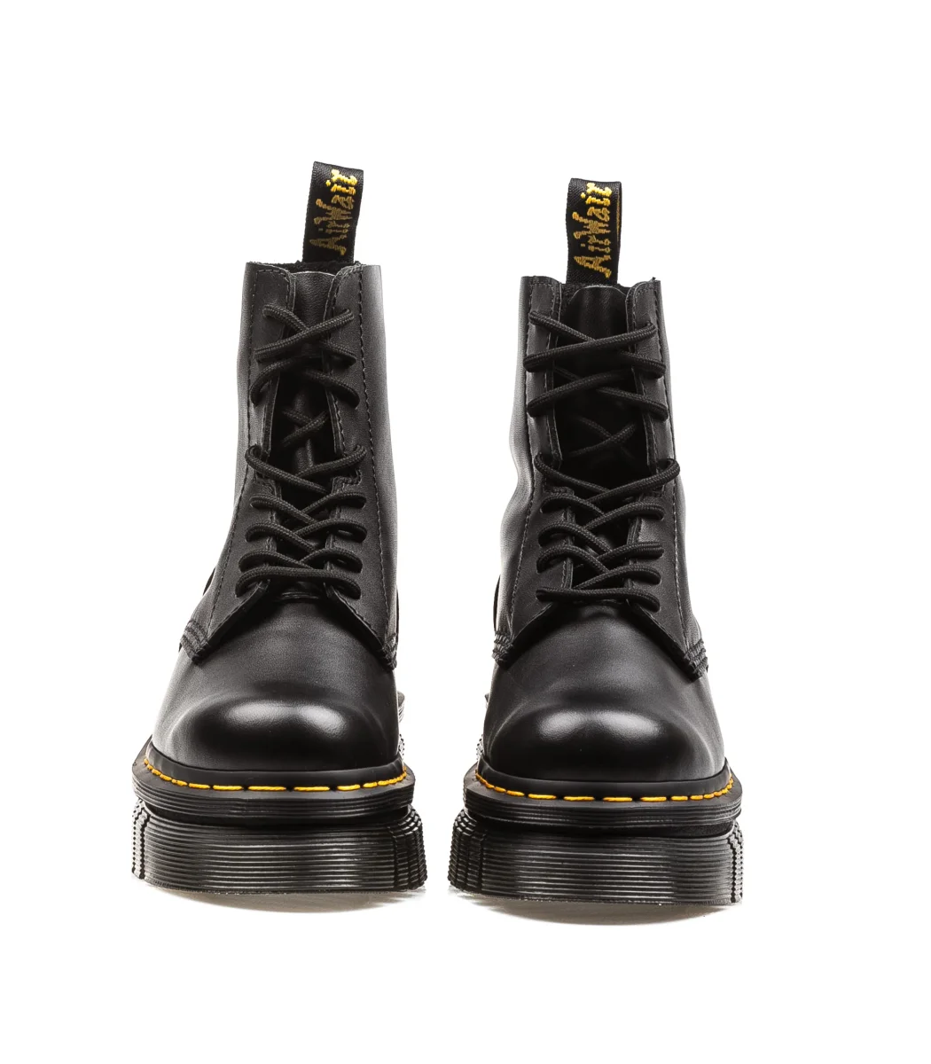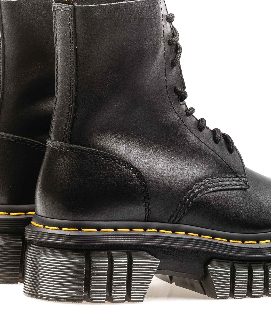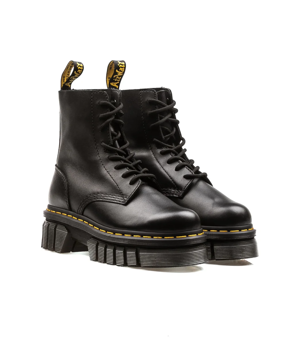Scarponcino Dr Martens audrick 8-eye nappa lux colore nero da donna con suola in gomma alta e dettaglio cucituira a vista giallo comoda e resistente in qualsiasi condizione atmosferica.