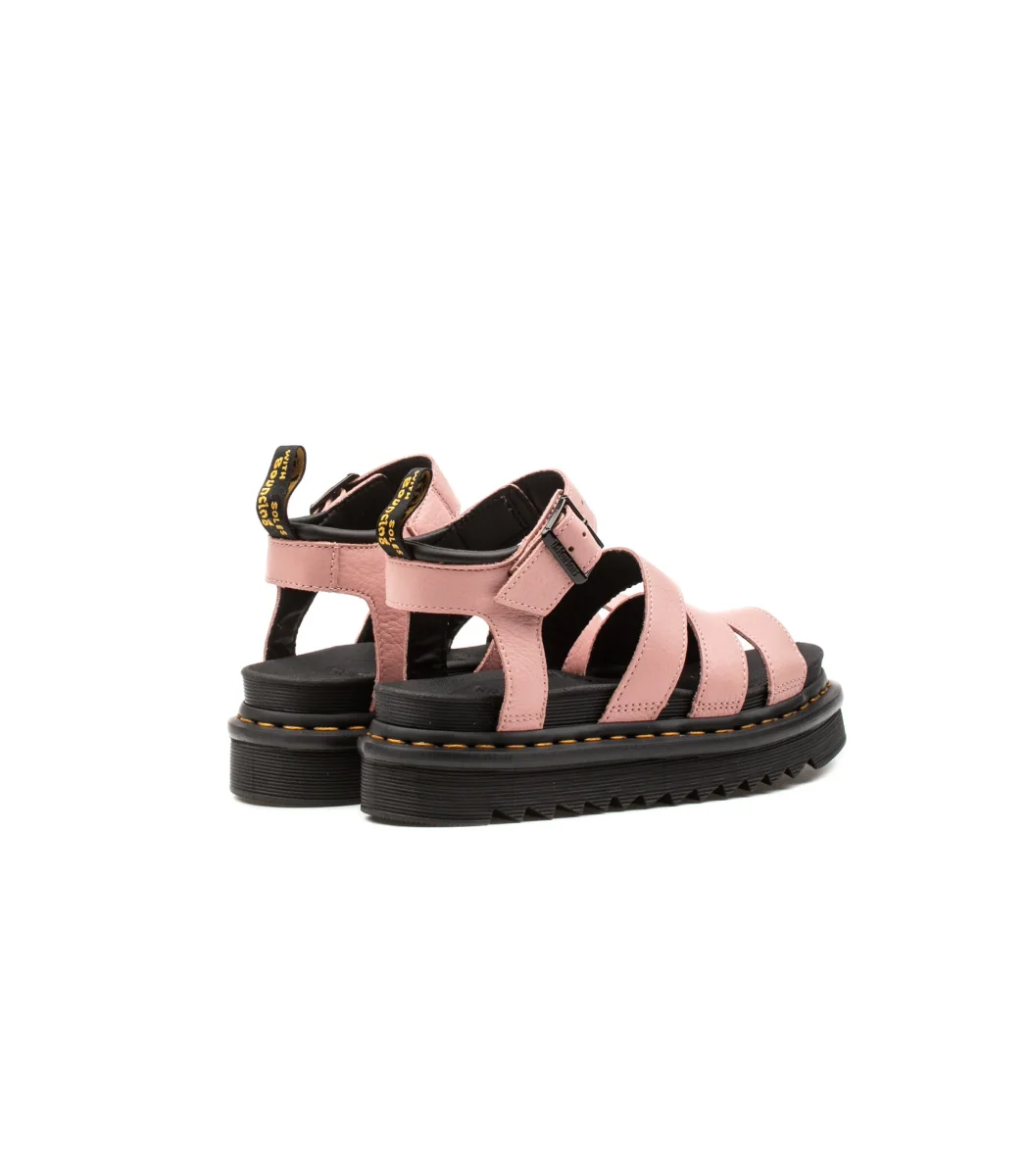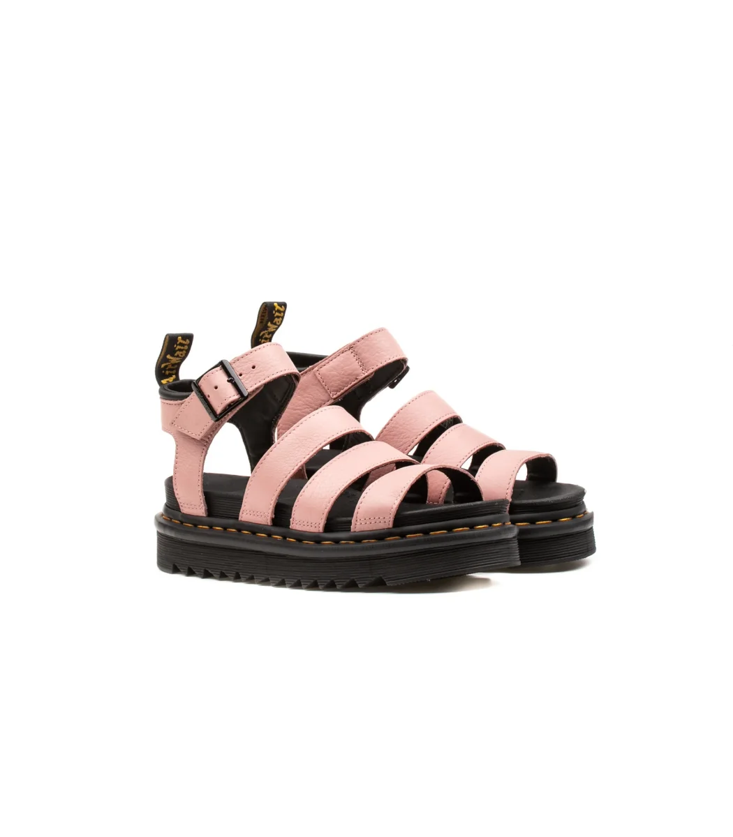 Sandalo Dr. Martens modello blaire hydro colore rosa da donna con suola in gomma e dettaglio cucitura giallo allacciatura frontale regolabile con fibia e struttura in morbida pelle.