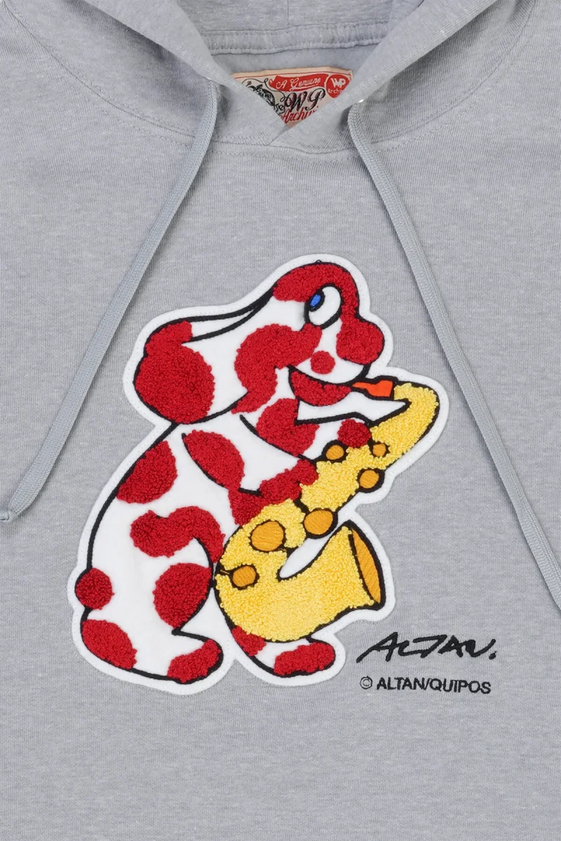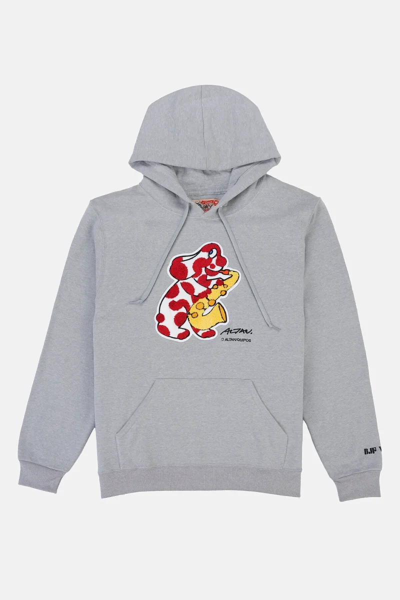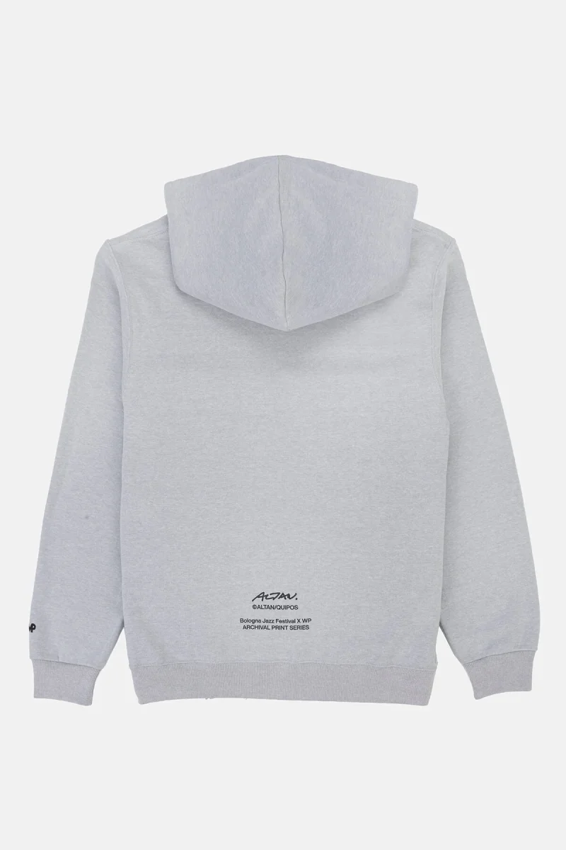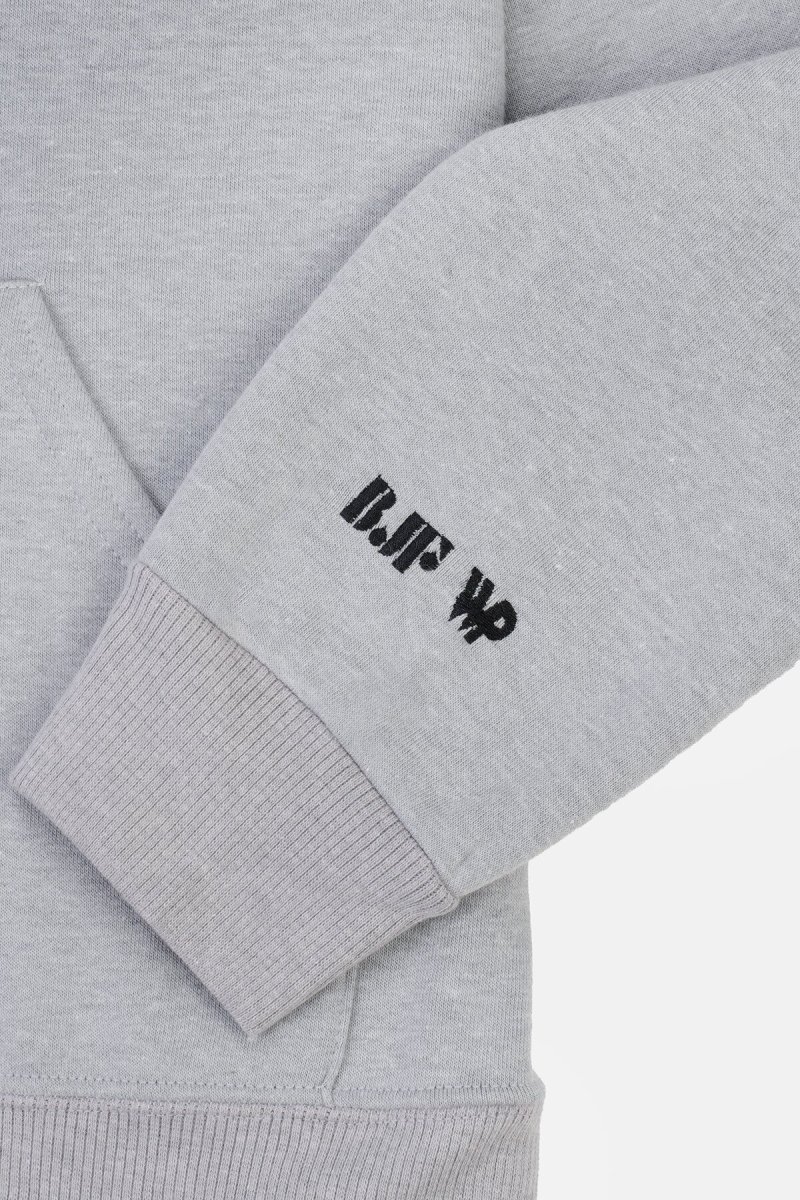 La felpa 100% cotone su base grigio melange presenta una patch in punto spugna cucita sul fronte del capo . Il modello presenta un cappuccio e il marsupo centrale che gli coferisce mggiore versatilita’.
