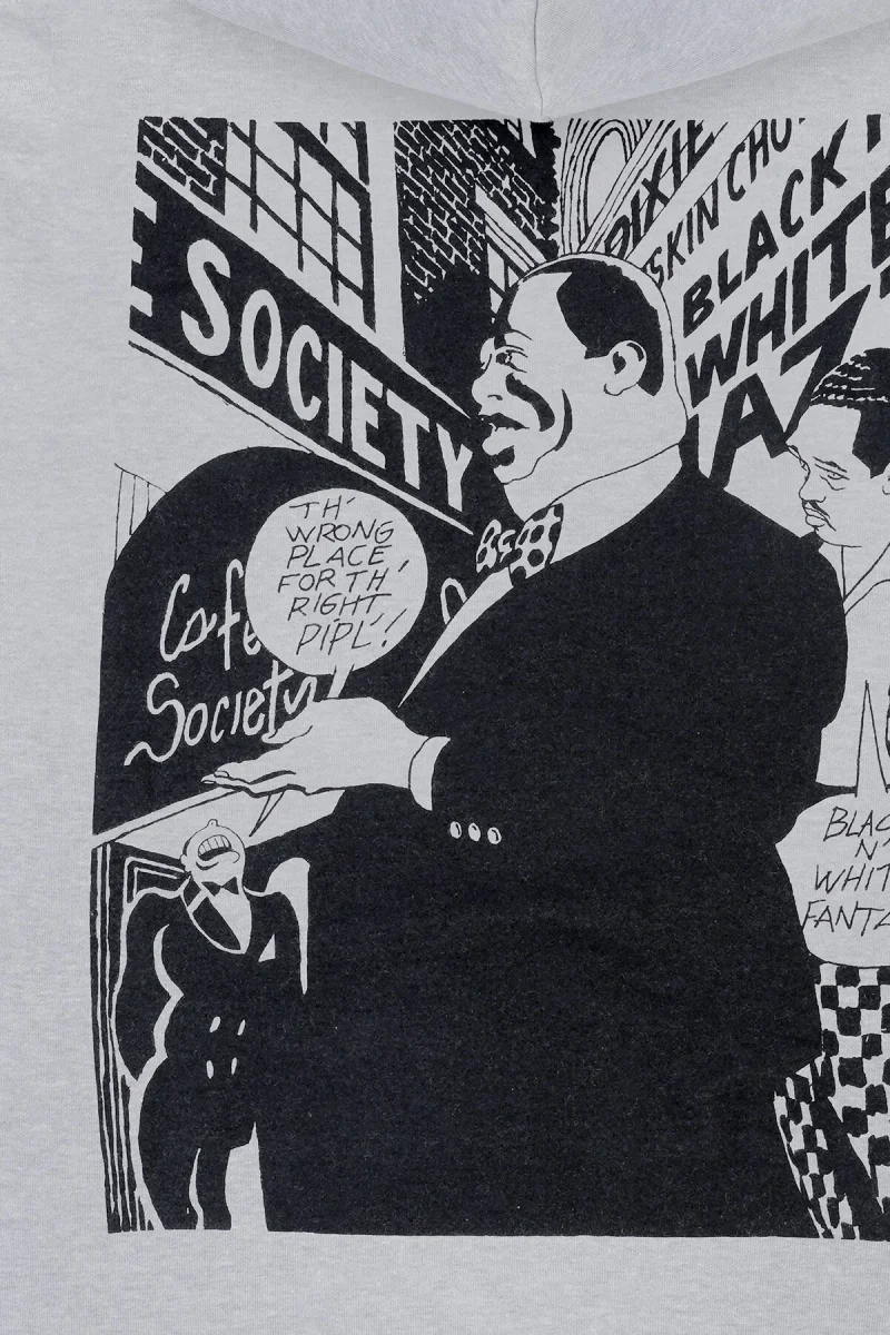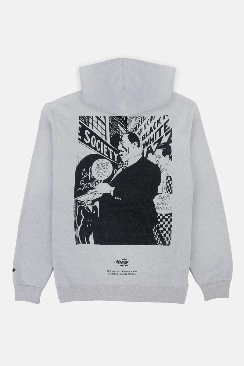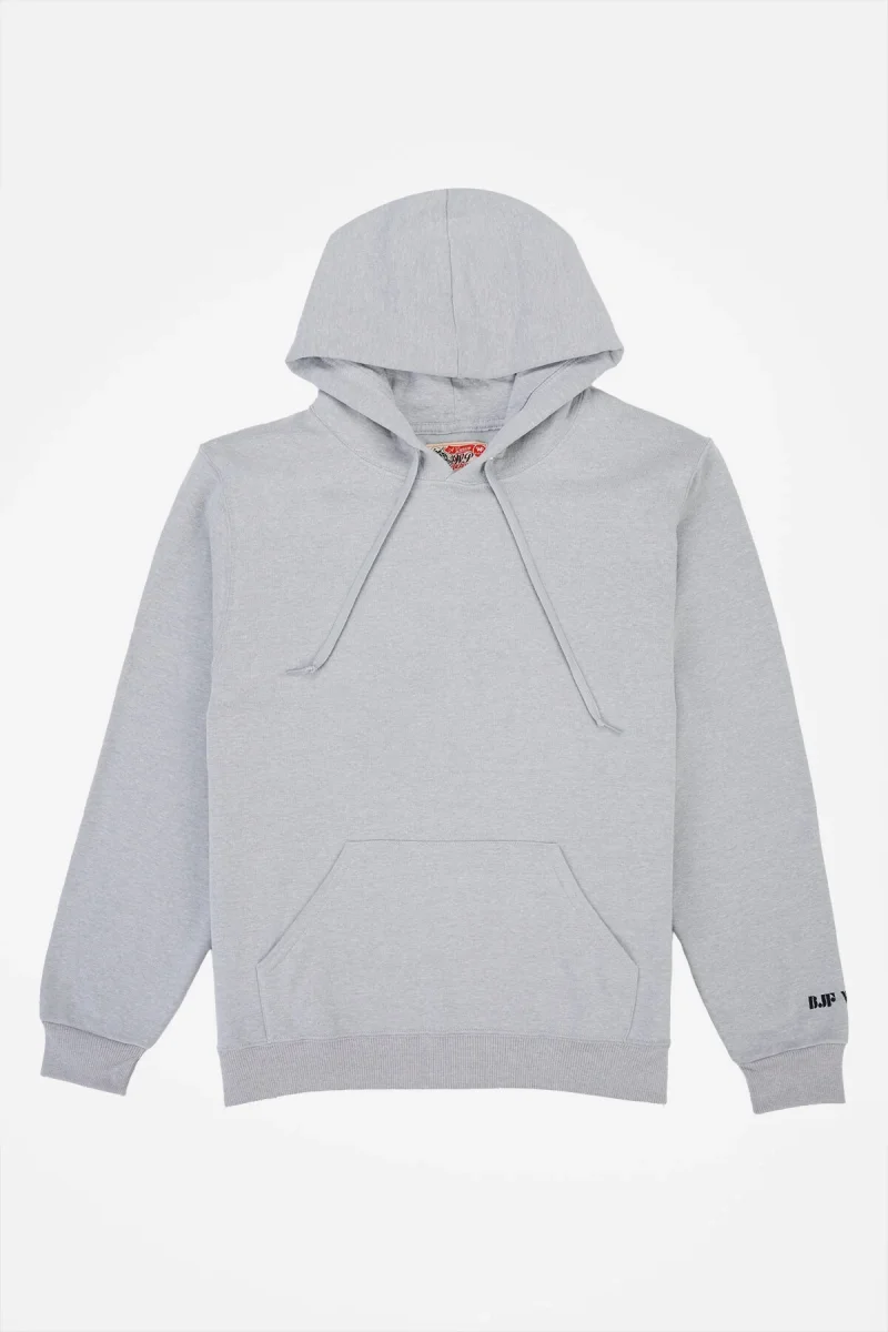 La felpa 100% cotone su base grigio melange presenta una patch in punto spugna cucita sul fronte del capo . Il modello presenta un cappuccio e ilmarsupo centrale che gli coferisce mggiore versatilita’