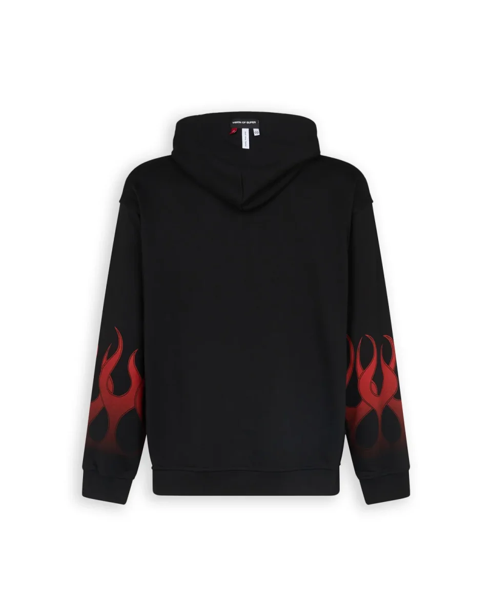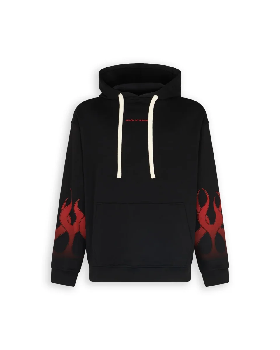 Felpa con cappuccio Vision Of Super colore nero con fiamme rosse stampate e logo frontale. Morbido tessuto in cotone.