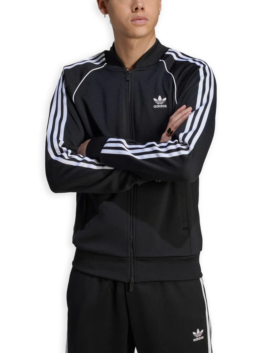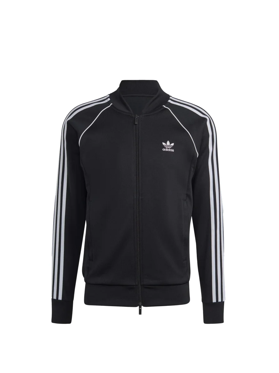 Felpa zip Adidas modello sst tt black white da uomo con chiusura zip frontale logo ricamato e iconiche bande lungo le maniche, elastico in vita e sui polsi.