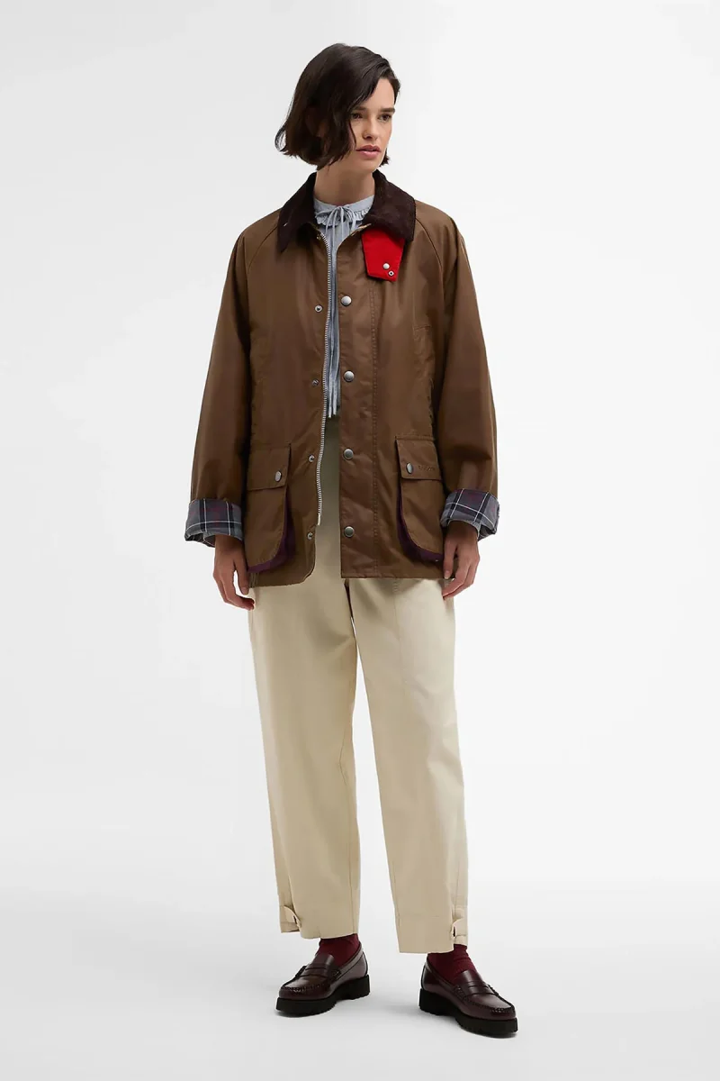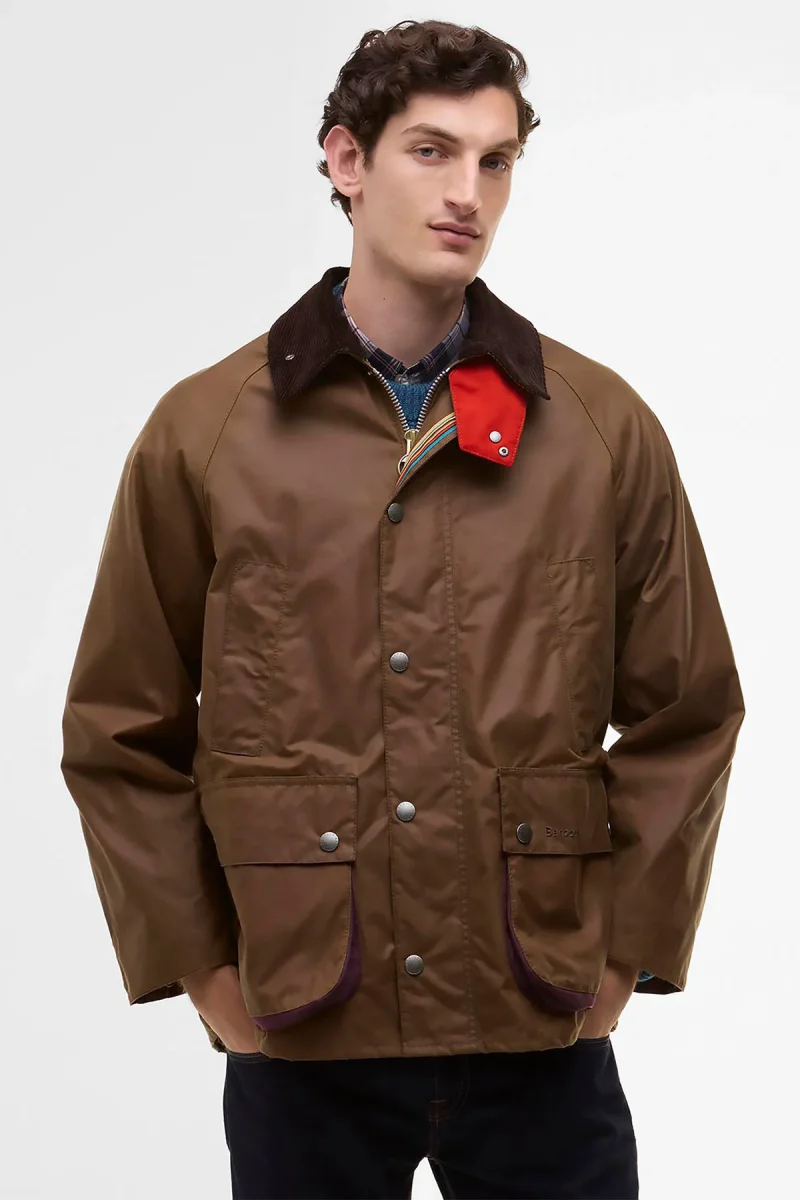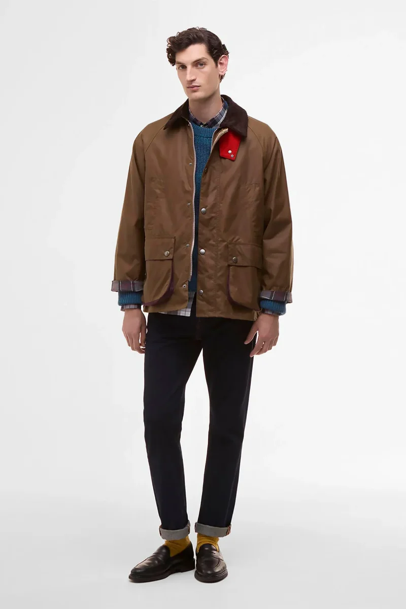 Due icone della moda britannica si incontrano nella giacca cerata Bedale oversize di Paul Smith loves Barbour, rivisitazione di un capospalla d’ispirazione heritage in chiave più sbarazzina. Caratterizzato dagli inconfondibili dettagli di Paul Smith, quali il cinturino sotto il mento in fustagno riproposto in una vivace tonalità arancione, una fodera con stampa raffigurante delle mucche e un gonnellino antivento a righe, questo capospalla si distingue per la sua praticità e originalità. L’etichetta blu Klein all’interno si ispira ai biglietti della sfilata Primavera/Estate 2012 di Paul Smith e aggiunge un tocco di colore a questo intramontabile modello in cotone cerato. Impreziosita da polsini antivento a righe e da un passante funzionale che consente l’aggiunta di un gilet, questa giacca rappresenta il mix perfetto della maestria artigianale di ispirazione agreste di Barbour e il fascino inconfondibile di Paul Smith.