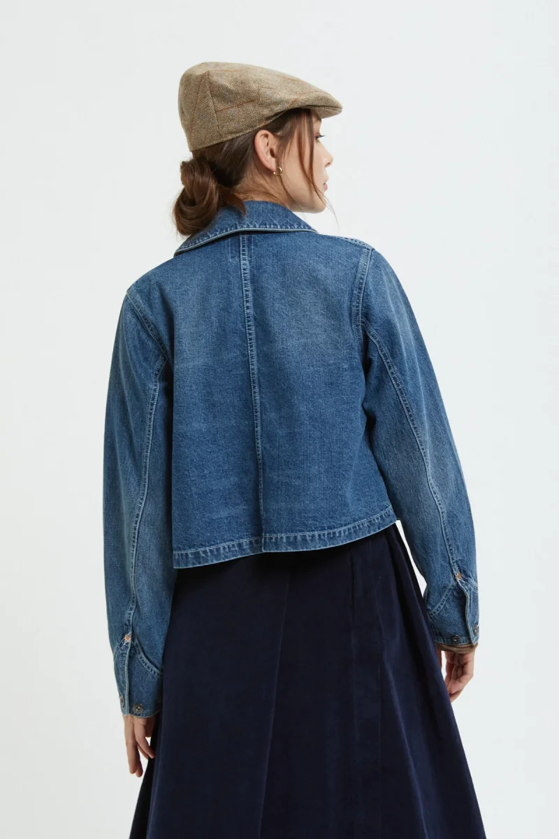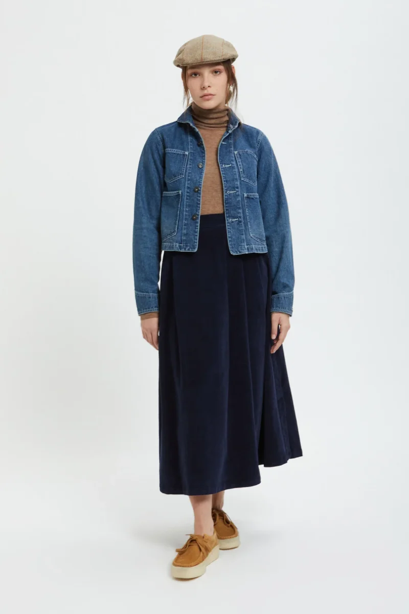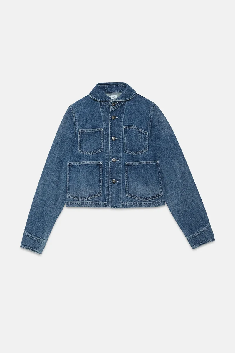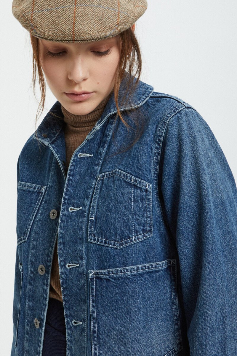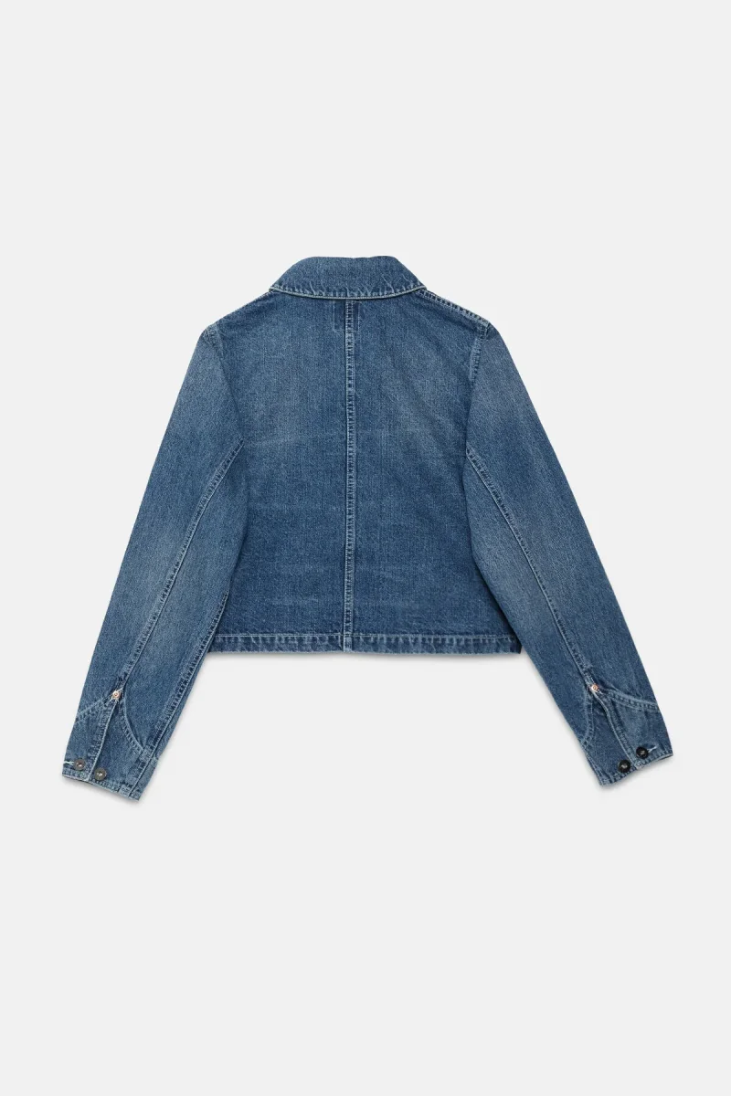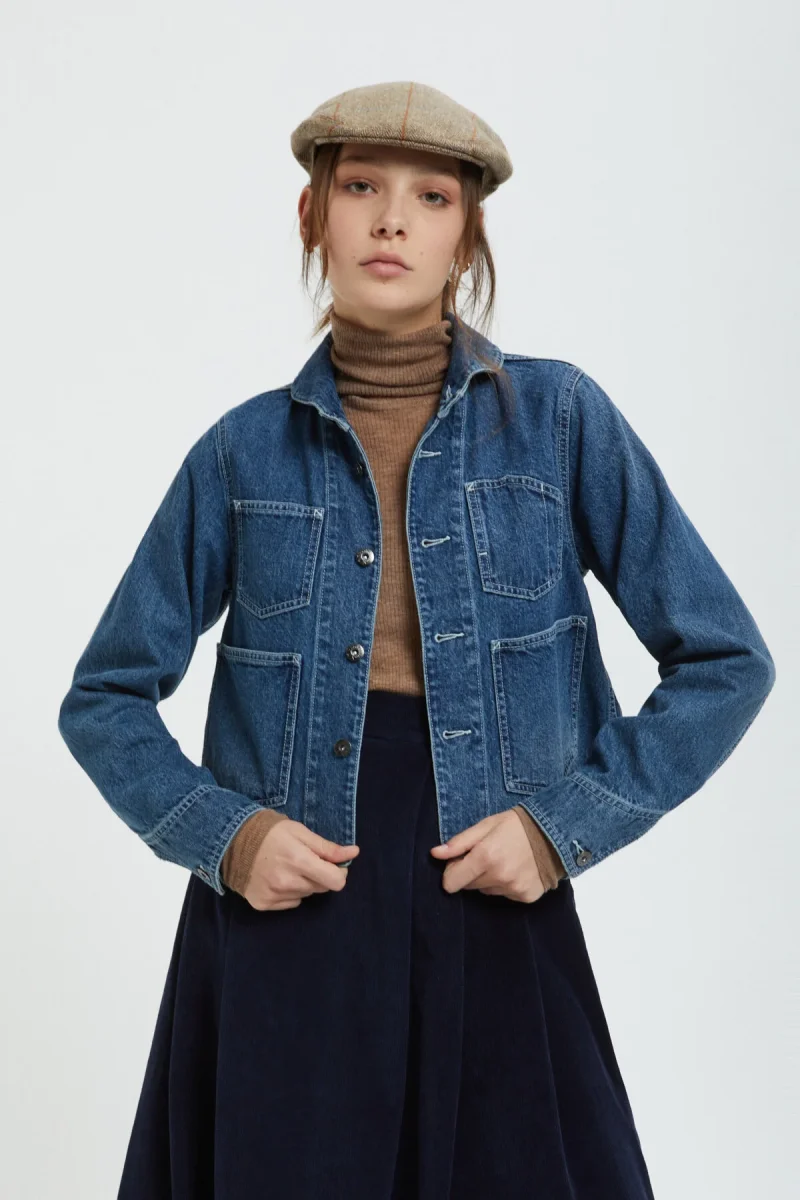 Questa giacca ha un aspetto robusto ed è caratterizzata da tasche funzionali, comunemente note come “tasche gacha”, tra cui una tasca per l’orologio e una tasca per la penna. La sua caratteristica più distintiva sono le proporzioni: la larghezza ampia e la lunghezza decisamente più corta creano un equilibrio che valorizza lo stile femminile. Realizzata in denim domestico da 12 once, spesso e resistente, la giacca presenta una finitura vintage che conferisce un aspetto autentico, ma è anche elastica, per garantire comfort e libertà di movimento.