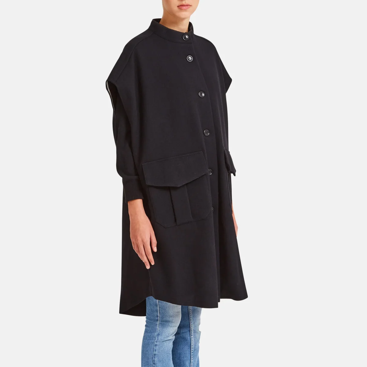 Gilet over in lana con collo in piedi, caratterizzato da due campienti tasche frontali. Confortevole e perfetto per la stagione autunnale.
