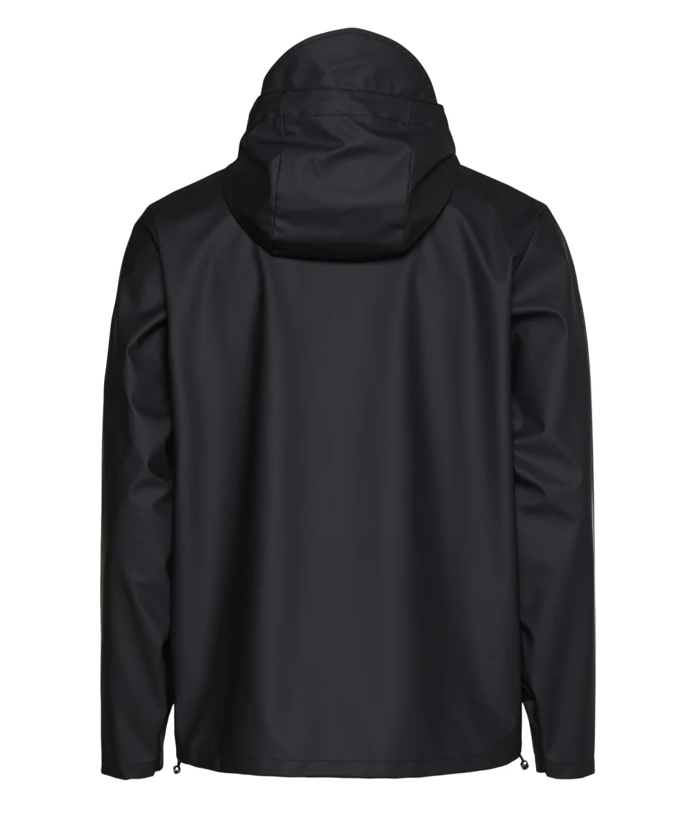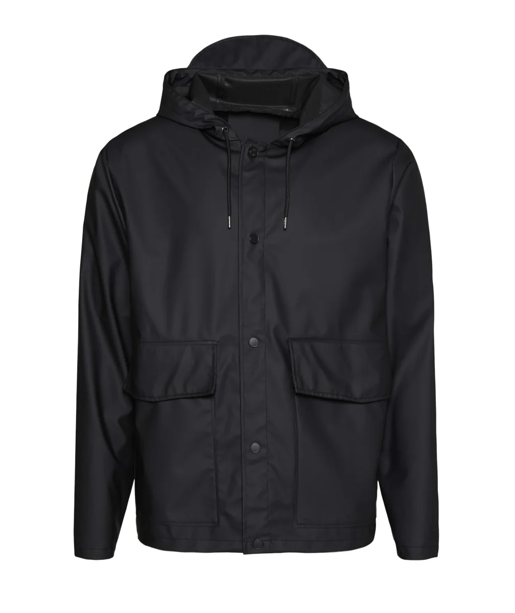 La short hooded di Rains è una giacca impermeabile unisex con bottoni, doppie tasche anteriori e cappuccio, colore nero.