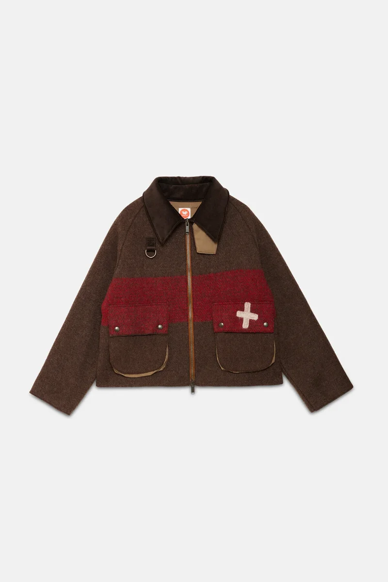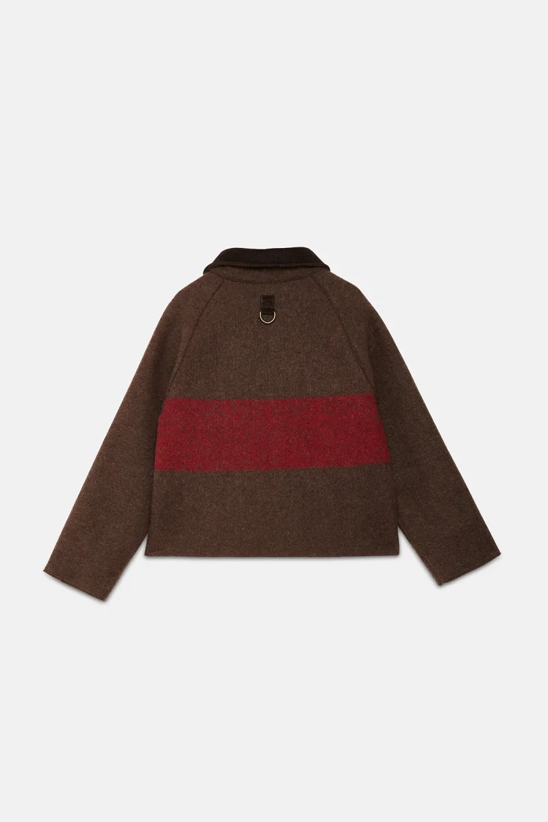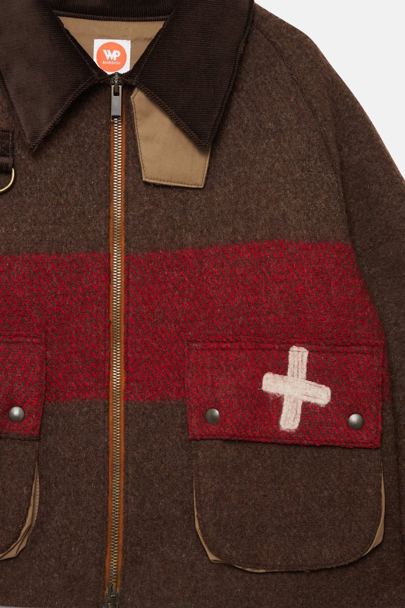 L’esterno di questa giacca WP Archivio rivisitata è realizzato con coperte militari vintage in lana a righe, risalenti principalmente agli anni Cinquanta. Foderata in cotone verde oliva, presenta una silhouette squadrata che consente di indossarla facilmente sopra altri capi. È dotata di un colletto in velluto a coste, di un anello a D sul petto, utile sia come dettaglio decorativo sia per appendere oggetti, e di due tasche a toppa sul davanti. Questo capo è un pezzo unico di alta qualità, realizzato in Italia con tessuti riciclati.