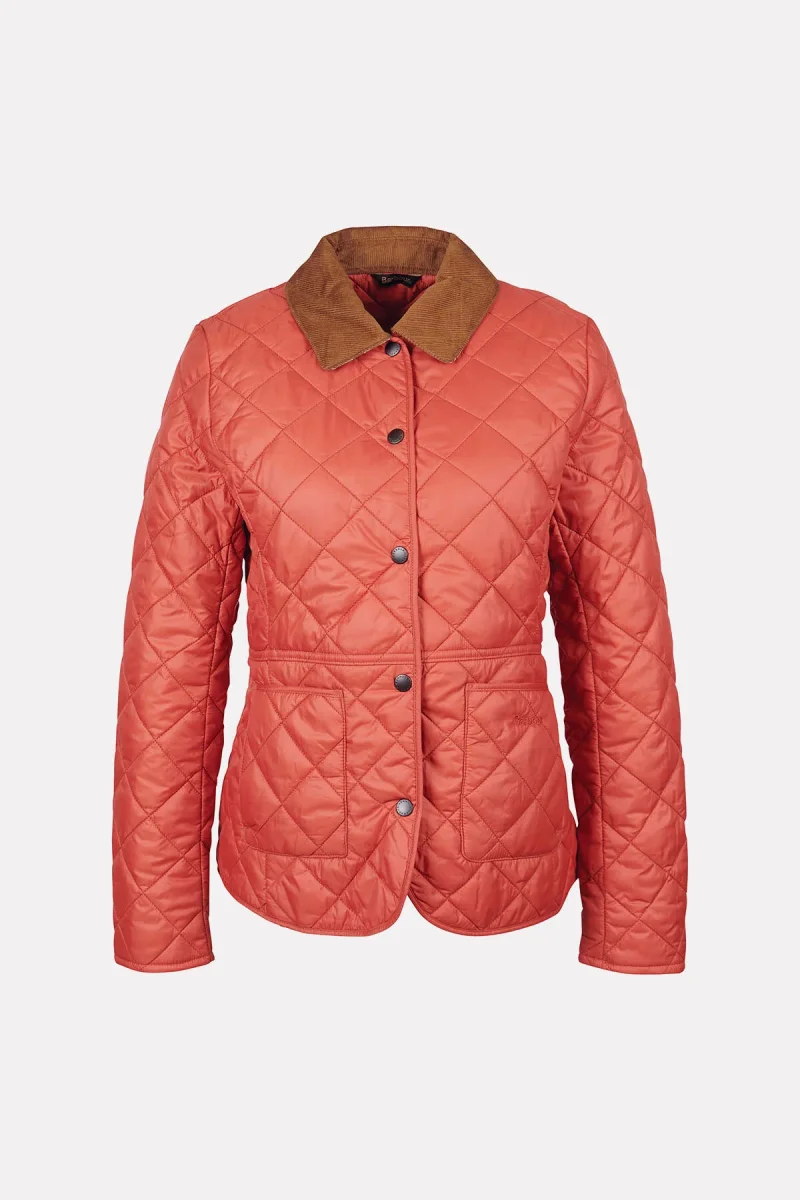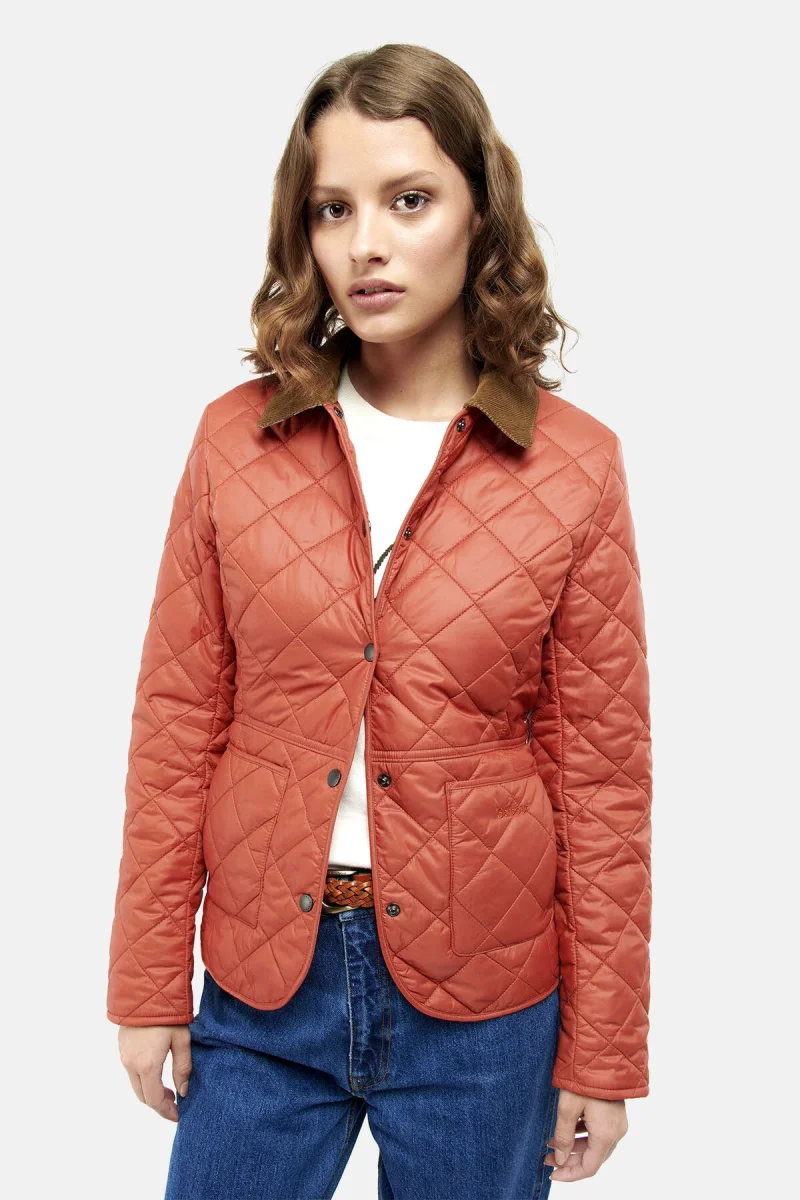 Il Barbour Deveron è una giacca con trapunta a rombi, colletto in velluto a costine e una fodera femminile a contrasto. Presenta due pratiche tasche applicate sul davanti e il logo Barbour ricamato per un tocco di stile inconfondibile.