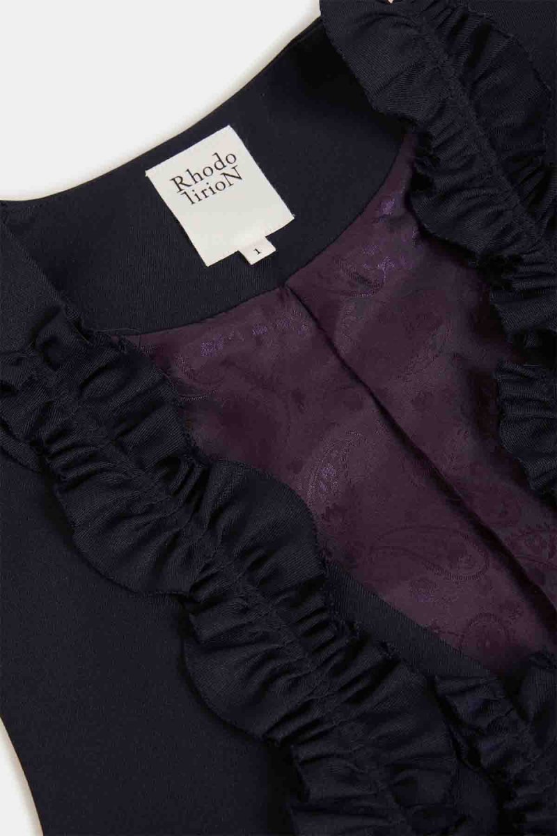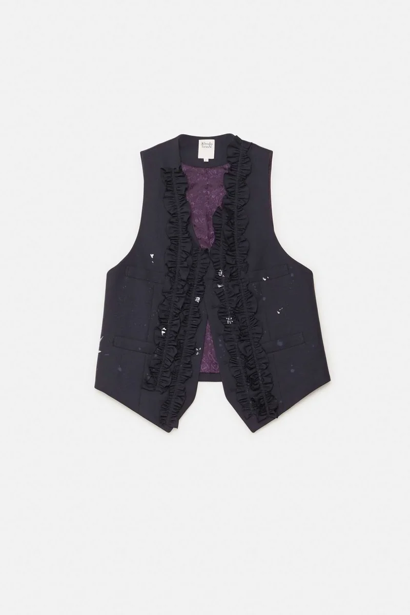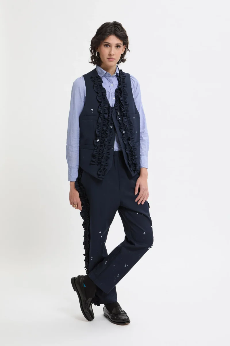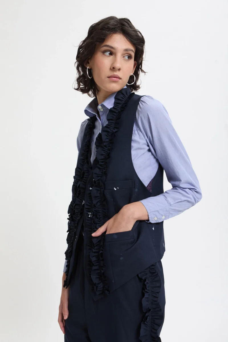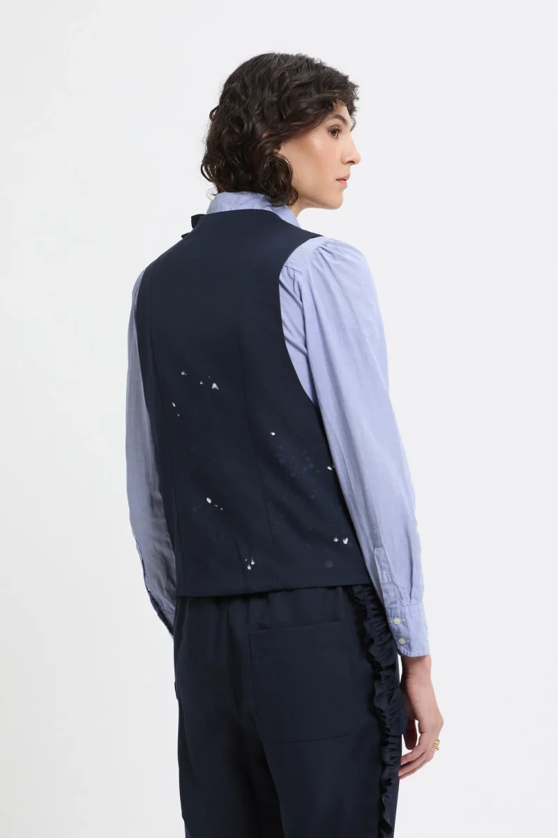 Questo gilet classico presenta schizzi di vernice stampati a mano che richiamano l’abbigliamento da lavoro. Il suo design raffinato integra volant applicati in modo casuale. Pur essendo presenti le asole, i bottoni sono volutamente omessi, così da permetterti di applicare quelli che preferisci.