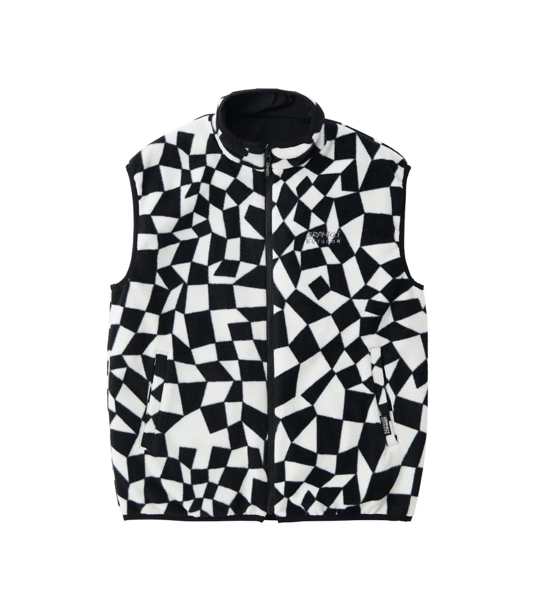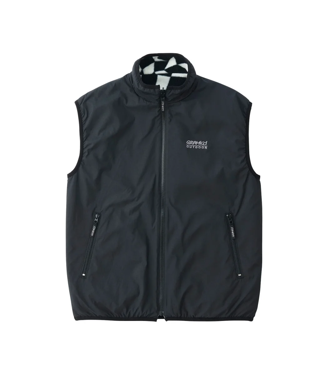 Gilet Gramicci reversibile in pile e tessuto tecnico fantasia a scacchi o nylon nero con zip frontale e tasche latertali comfort garantito in qualsiasi condizione atmosferica.
