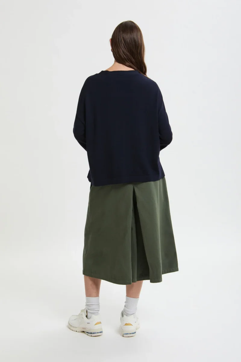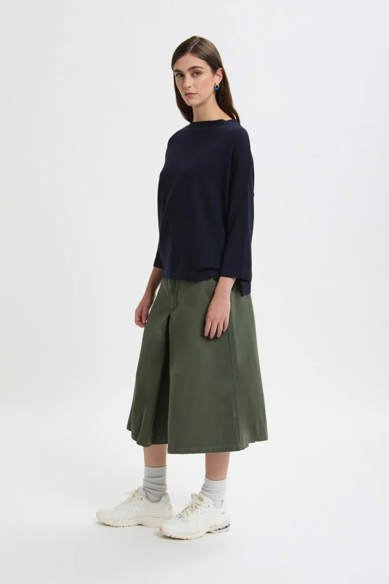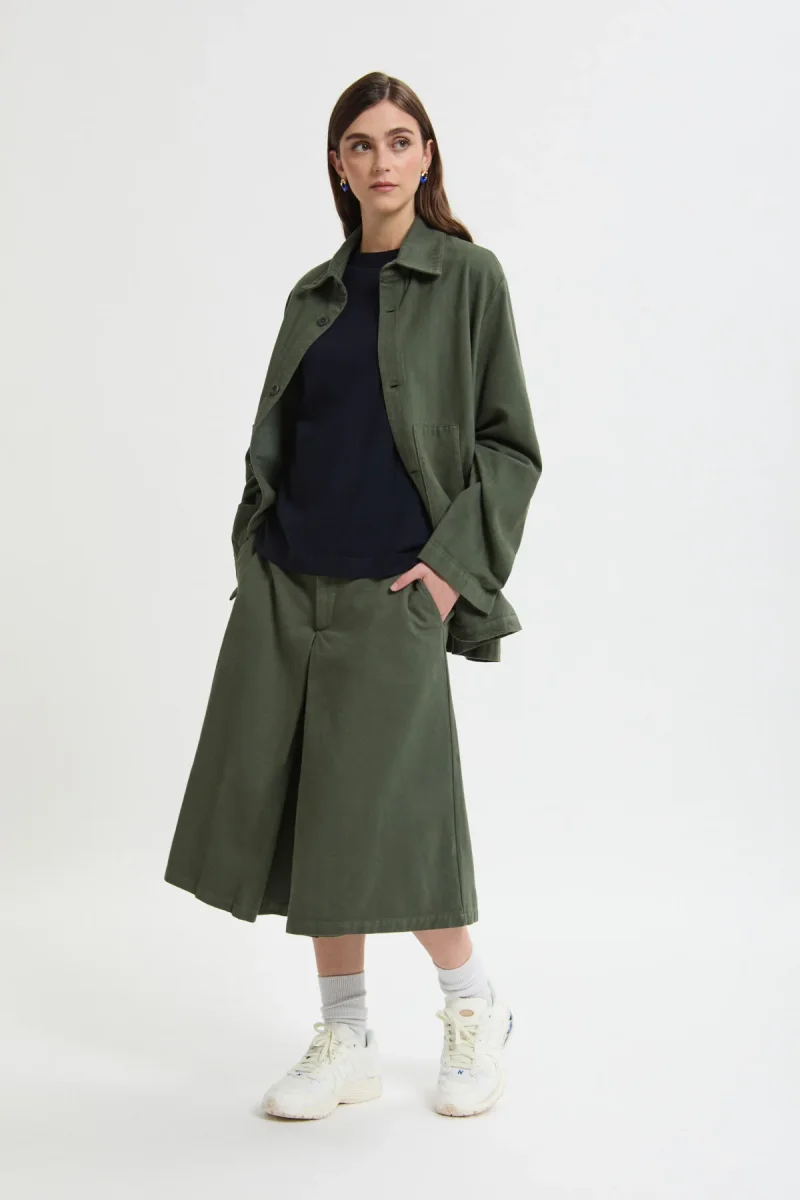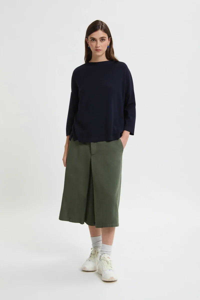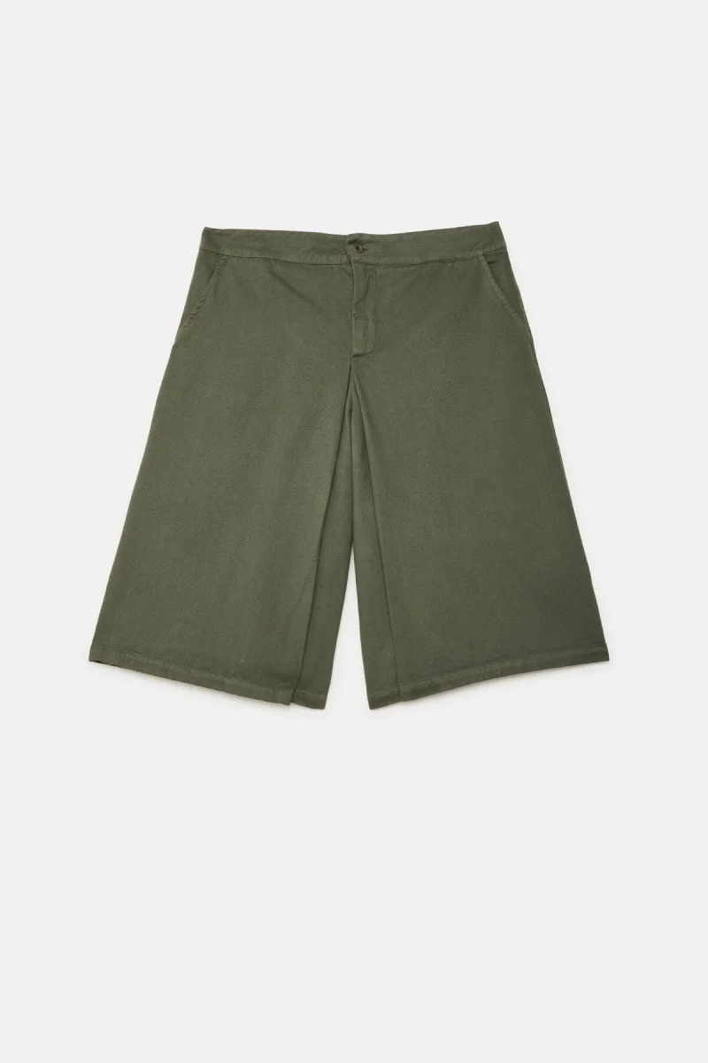Gonna-pantalone dallo stile essenziale e contemporaneo, caratterizzati da un design pulito e una silhouette ampia che unisce comfort e personalità.