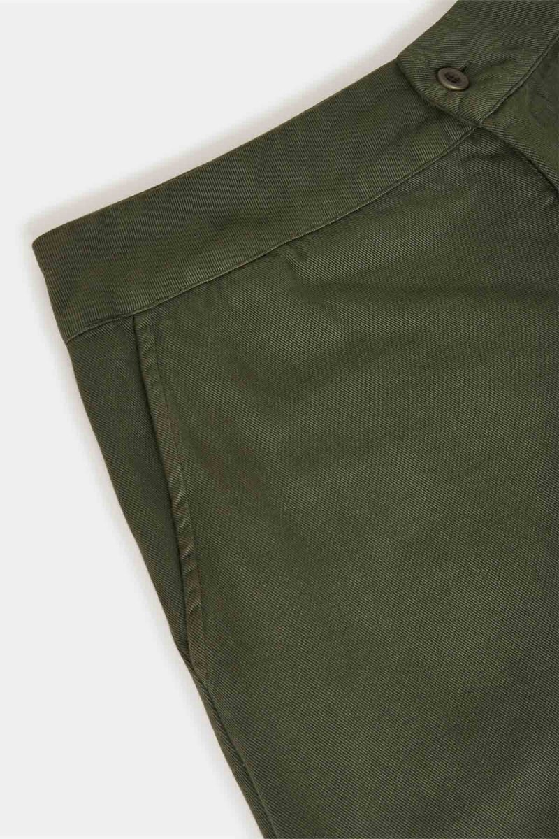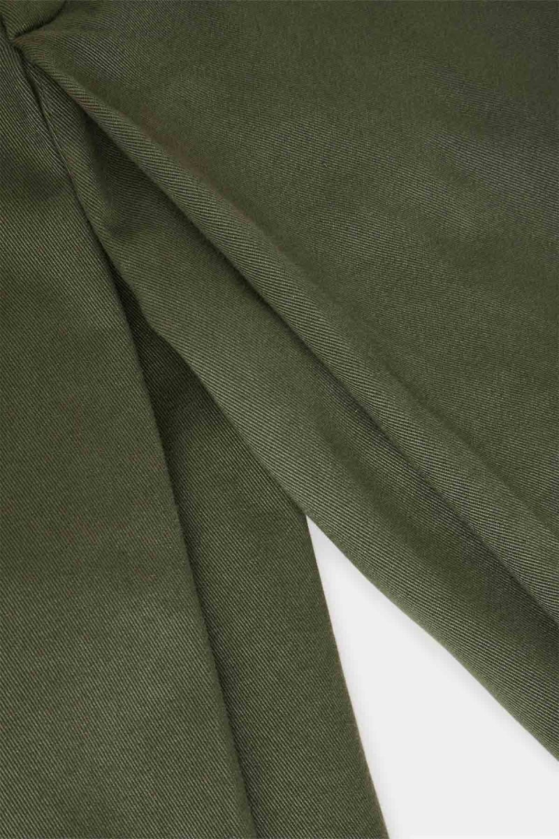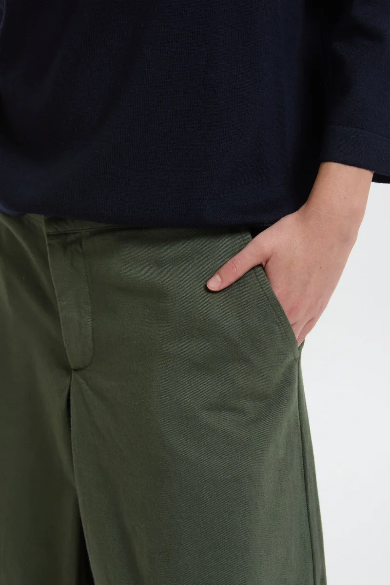 La vita regolare e la gamba larga e fluida creano un volume armonioso, ideale per un look rilassato ma curato. Il taglio lineare e il tono verde oliva donano versatilità, rendendoli perfetti da abbinare a camicie, top o giacche coordinate per un’eleganza naturale e senza tempo.